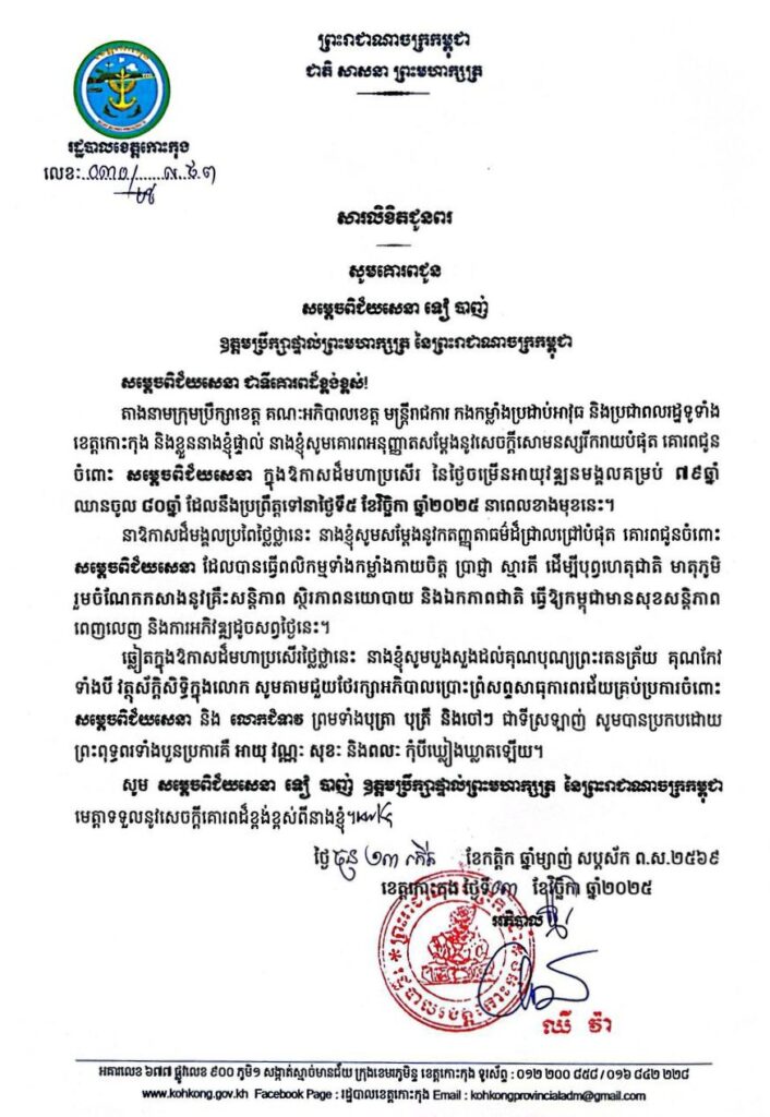 សារលិខិតជូនពរ សូមគោរពជូន សម្តេចពិជ័យសេនា ទៀ បាញ់ ឧត្តមប្រឹក្សាផ្ទាល់ព្រះមហាក្សត្រ នៃព្រះរាជាណាចក្រកម្ពុជា ក្នុងឱកាសដ៏មហាប្រសើរ នៃថ្ងៃចម្រើនអាយុវឌ្ឍនមង្គលគម្រប់ ៧៩ឆ្នាំ ឈានចូល ៨០ឆ្នាំ ដែលនឹងប្រព្រឹត្តទៅនាថ្ងៃទី៥ ខែវិច្ឆិកា ឆ្នាំ២០២៥ នាពេលខាងមុខនេះ