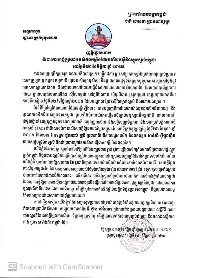 រដ្ឋបាលស្រុកបូទុមសាគរ សូមប្រកាសថ្កោលទោស ចំពោះការបាញ់ប្រហាររបស់កងកម្លាំងថៃមកលើជនស៊ីវិលស្លូតត្រង់កម្ពុជា នៅថ្ងៃទី១២ ខែវិច្ឆិកា ឆ្នាំ២០២៥
