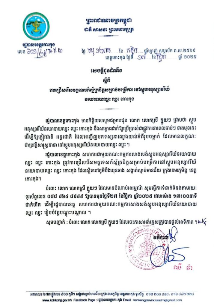 សេចក្តីជូនដំណឹង ស្តីពីការជ្រើសរើសមគ្គទេសក៍ស្ម័គ្រចិត្តសម្រាប់បម្រើការ នៅស្តូបអនុស្សាវរីយ៍ នយោបាយឈ្នះ ឈ្នះ កោះកុង