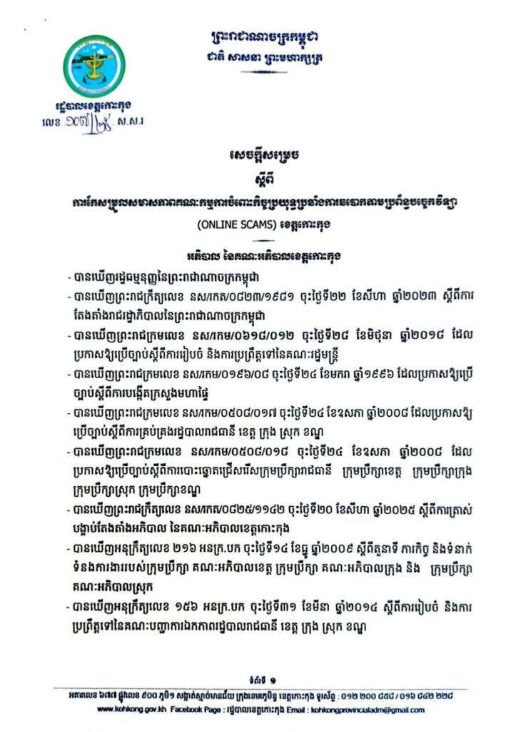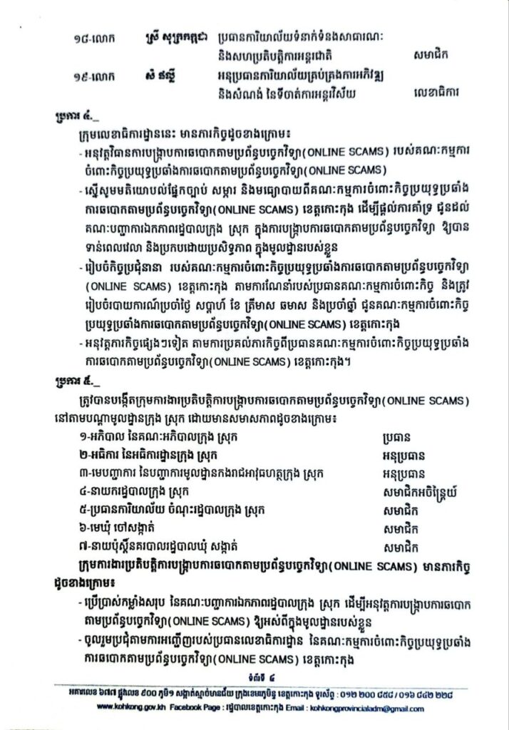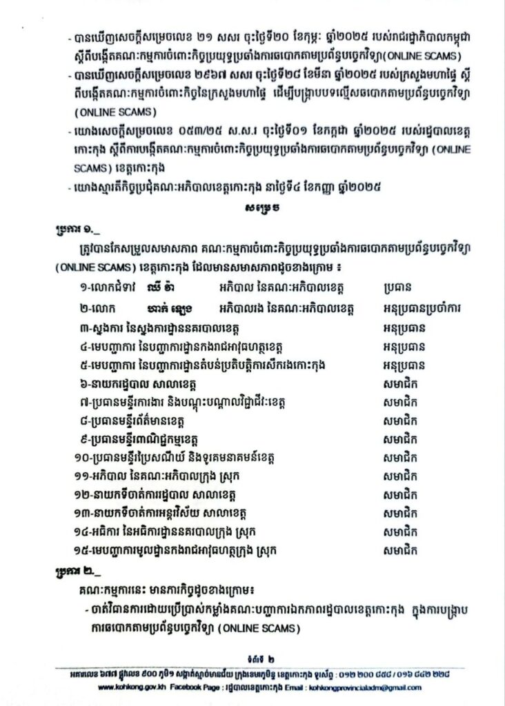 សេចក្តីសម្រេច ស្តីពីការកែសម្រួលសមាសភាពគណៈកម្មការចំពោះកិច្ចប្រយុទ្ធប្រឆាំងការឆបោកតាមប្រព័ន្ធបច្ចេកវិទ្យា (ONLINE SCAMS) ខេត្តកោះកុង