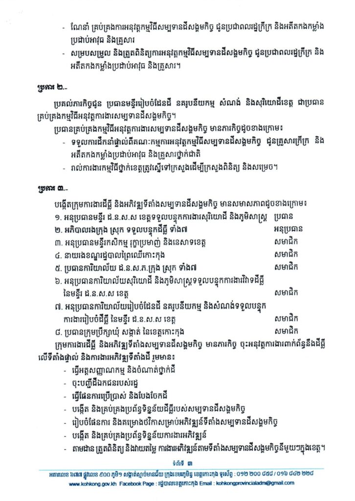 សេចក្តីសម្រេច ស្តីពីការកែសម្រួលសមាសភាពរចនាសម្ព័ន្ធគ្រប់គ្រង តួនាទី ភារកិច្ចទទួលខុសត្រូវ ក្នុងការអនុវត្តកម្មវិធីសម្បទានដីសង្គមកិច្ច ជូនប្រជាពលរដ្ឋក្រីក្រ និងអតីតកងកម្លាំងប្រដាប់អាវុធ និងគ្រួសារ ខេត្តកោះកុង