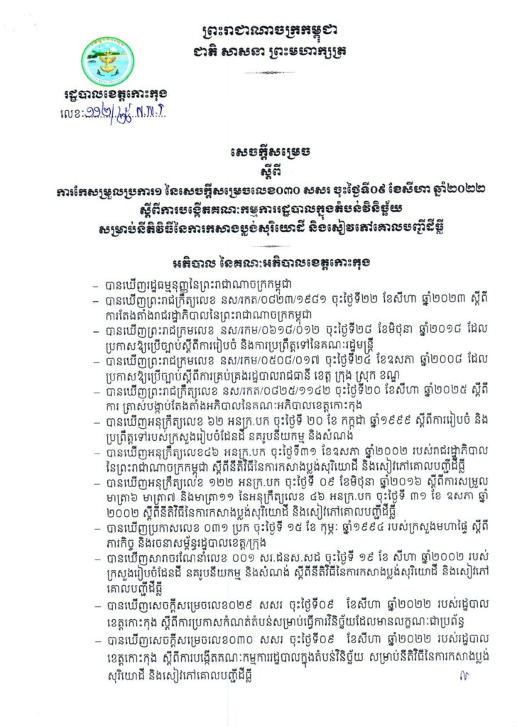 សេចក្តីសម្រេច ស្តីពីការកែសម្រួលប្រការ១ នៃសេចក្តីសម្រេចលេខ០៣០ សសរ ចុះថ្ងៃទី០៩ ខែសីហា ឆ្នាំ២០២២ ស្តីពីការបង្កើតគណៈកម្មការរដ្ឋបាលក្នុងតំបន់វិនិច្ឆ័យ សម្រាប់នីតិវិធីនៃការកសាងប្លង់សុរិយោដី និងសៀវភៅគោលបញ្ជីដីធ្លី