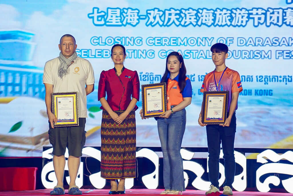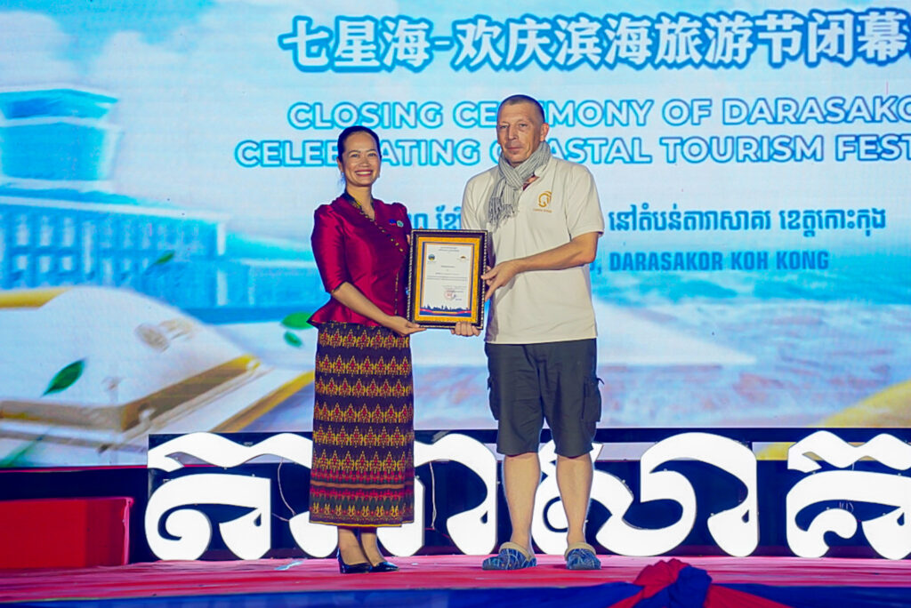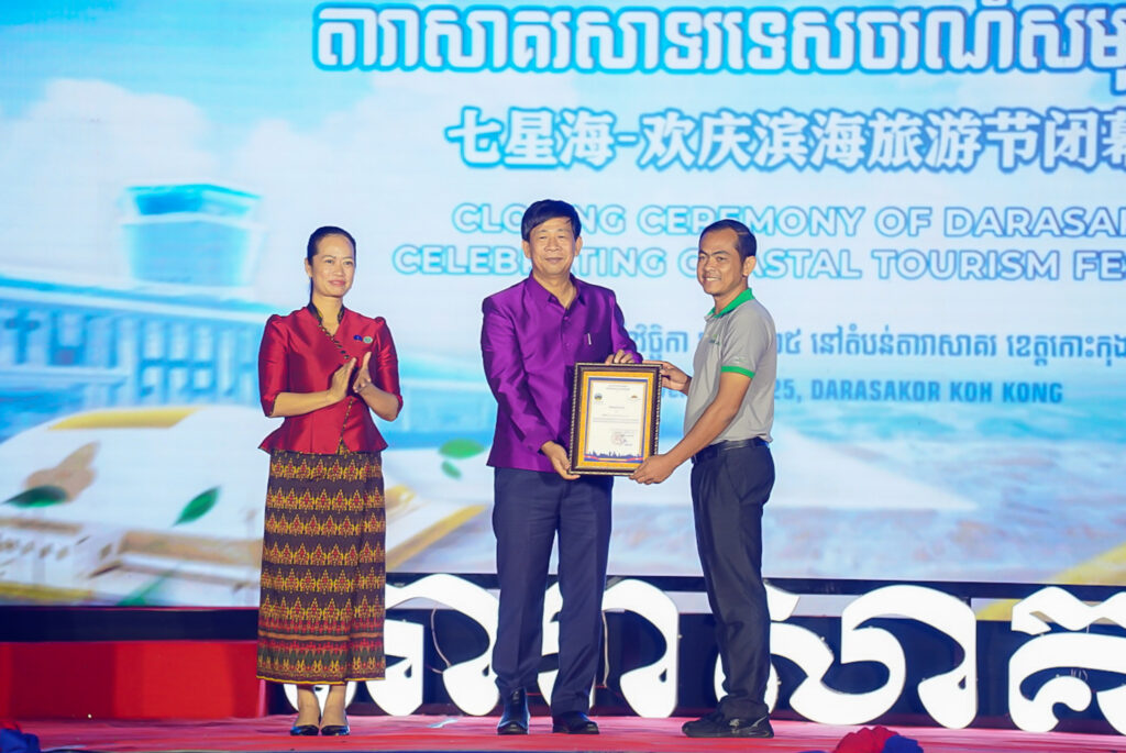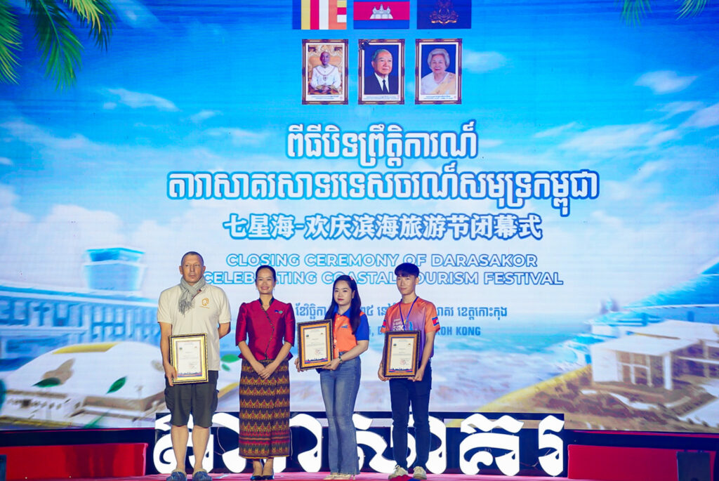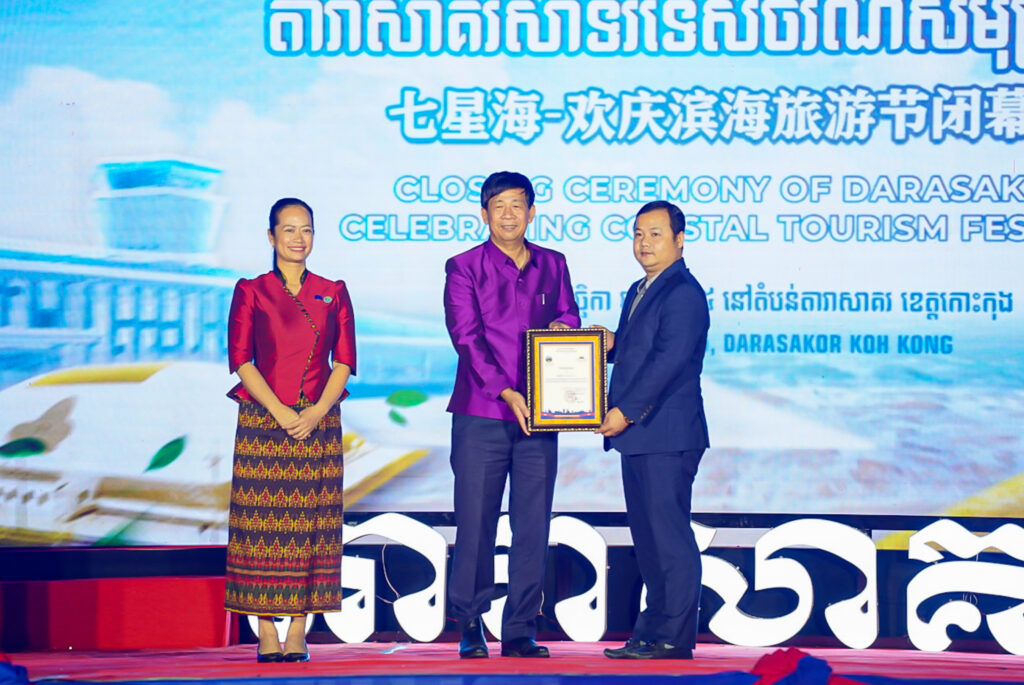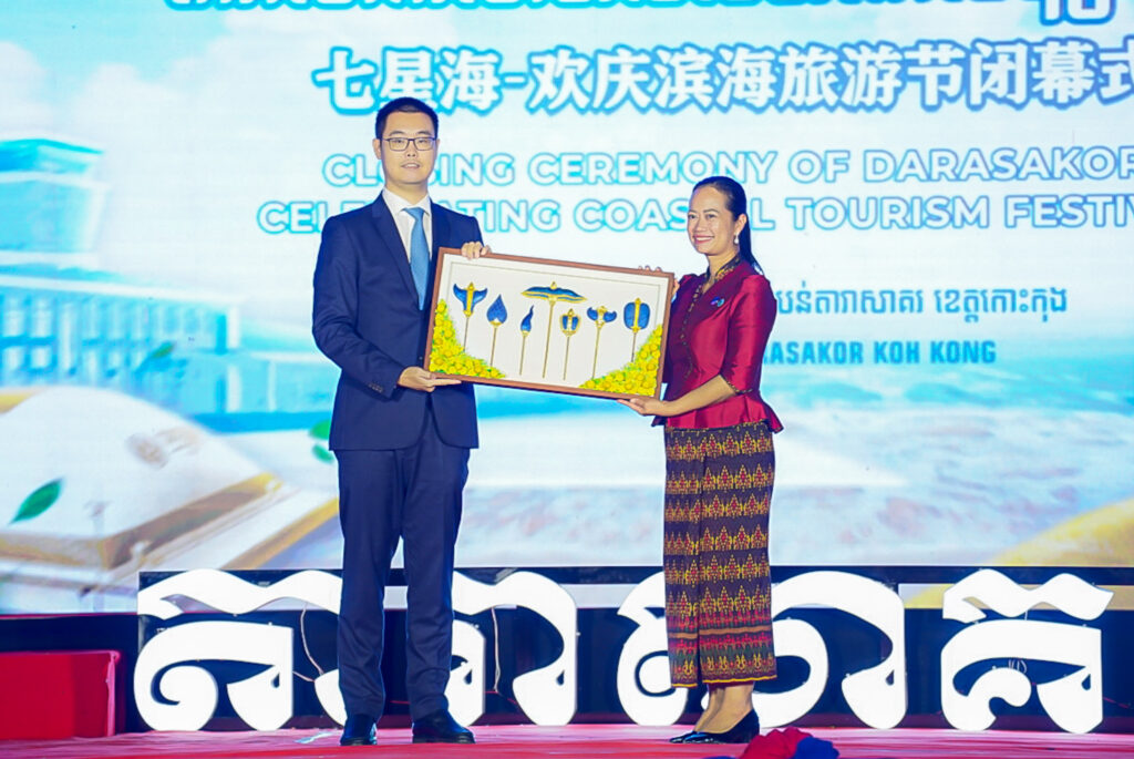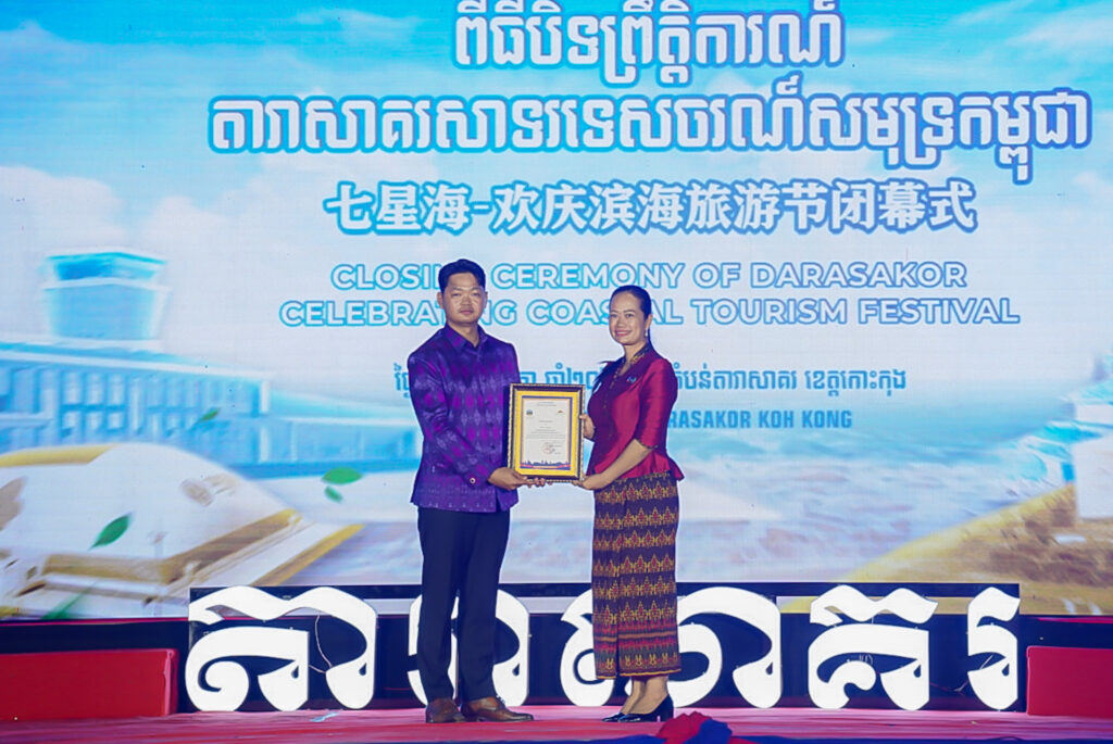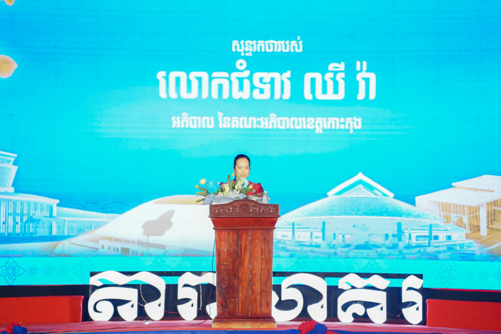 លោកជំទាវ ឈី វ៉ា អភិបាល នៃគណៈអភិបាលខេត្តកោះកុង បានអញ្ជើញស្វាគមន៍ឯកឧត្តម វ៉ាហេង ដាវុធ រដ្ឋលេខាធិការ តំណាងដ៏ខ្ពង់ខ្ពស់ ឯកឧត្តម ហួត ហាក់ រដ្ឋមន្ត្រីក្រសួងទេសចរណ៍ ក្នុងពិធីបិទព្រឹត្តិការណ៍ “តារាសាគរ សាទរទេសចរណ៍សមុទ្រ” របស់ក្រុមហ៊ុន Coastal City Development Group Co., Ltd.