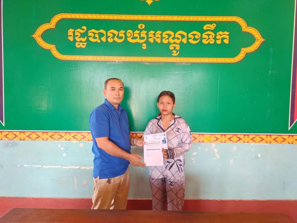 លោក យិន យួត ជំទប់ទី១ឃុំអណ្តូងទឹក បានអនុម័តជូនស្រ្តីមានផ្ទៃពោះចូលទៅក្នុងកម្មវិធីជាតិជំនួយសង្គម ក្នុងកញ្ចប់គ្រួសារ ដែលមានប័ណ្ណសមធម៌ ចំនួន២នាក់ ដែលមានទីលំនៅបច្ចុប្បន្នភូមិជីត្រេះ ឃុំអណ្តូងទឹក ស្រុកបូទុមសាគរ ខេត្តកោះកុង ដើម្បីទទួលបានអត្ថប្រយោជន៍ ក្នុងការអនុវត្តលក្ខខណ្ឌតាមការណែនាំរបស់មណ្ឌលសុខភាព ឬគ្រប់មន្ទីរពេទ្យរបស់រដ្ឋ។