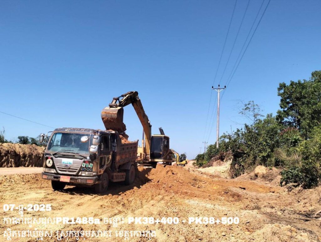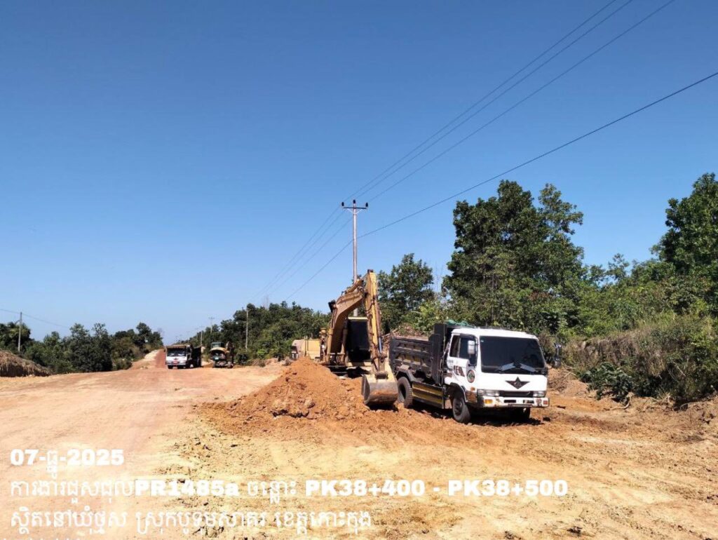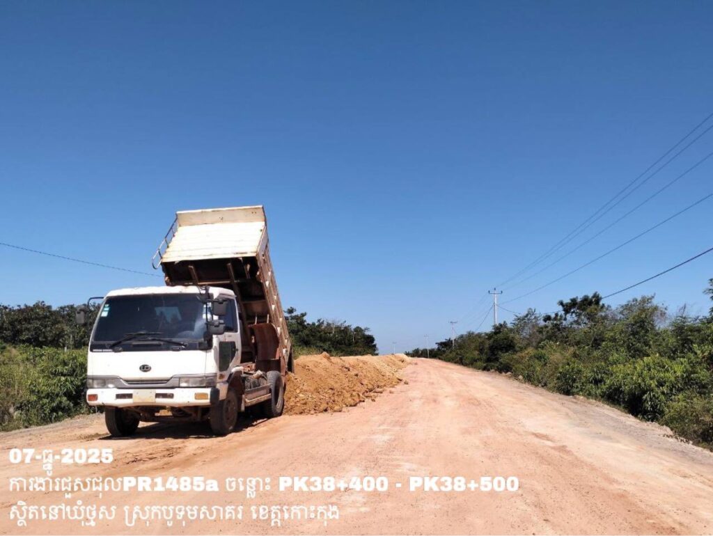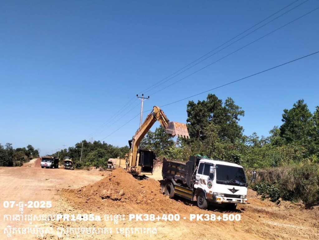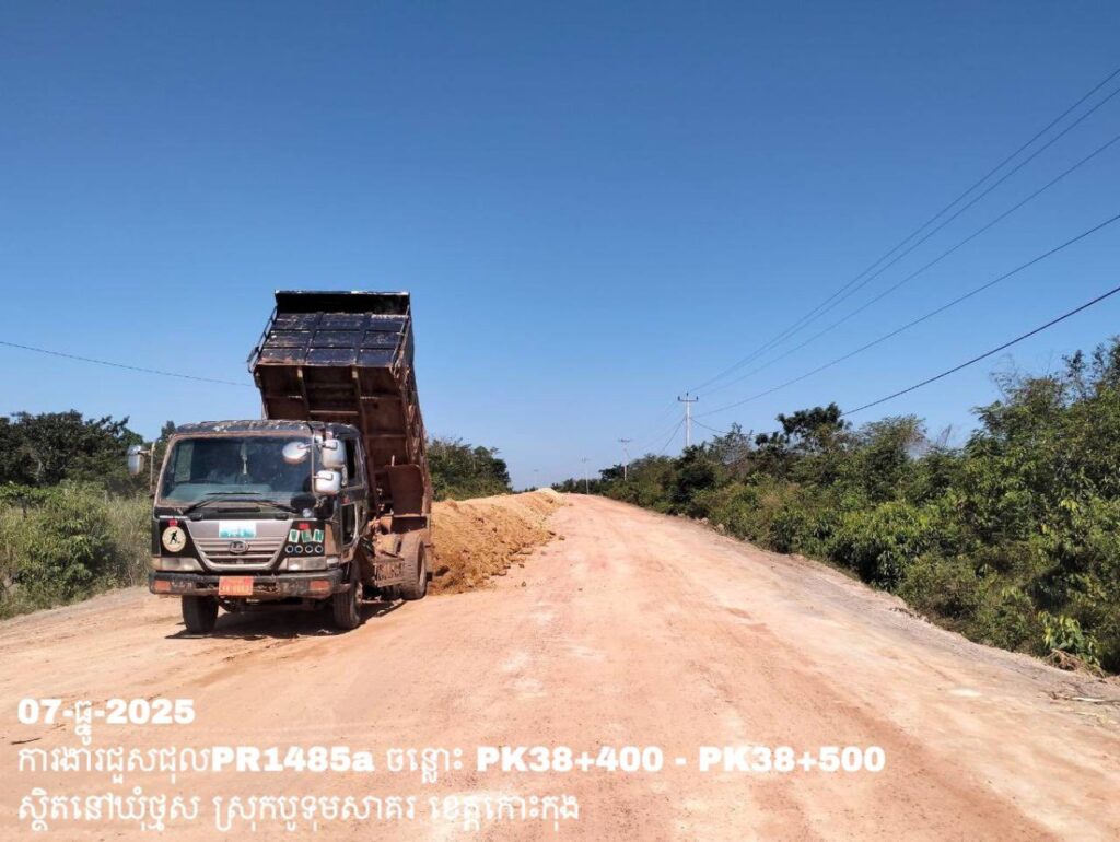 -បន្តការងារថែទាំខួបលើផ្លូវខេត្តលេខ 1485a ឃុំថ្មស ស្រុកបូទុមសាគរ ខេត្តកោះកុង សកម្មភាពការងារកាយសម្រុត និងចាក់ដីល្បាយថ្មត្រង់ចន្លោះ PK38+400 – PK38+500។