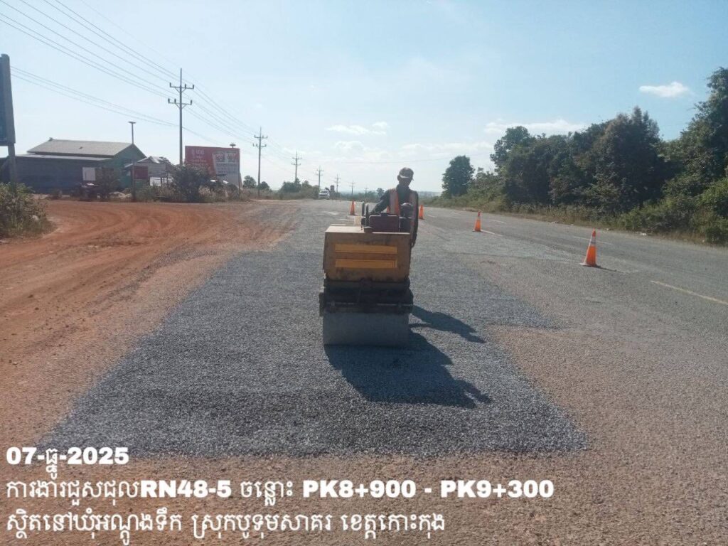 -បន្តការងារថែទាំប្រចាំលើផ្លូវជាតិលេខ 48-5 ឃុំអណ្ដូងទឹក ស្រុកបូទុមសាគរ ខេត្តកោះកុង សកម្មភាពការងារស្រោចកៅស៊ូ CRS-2 រោយថ្ម M12 លើសំបុកមាន់ត្រង់ចន្លោះ PK8+900 – PK9+300។