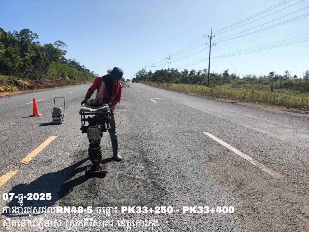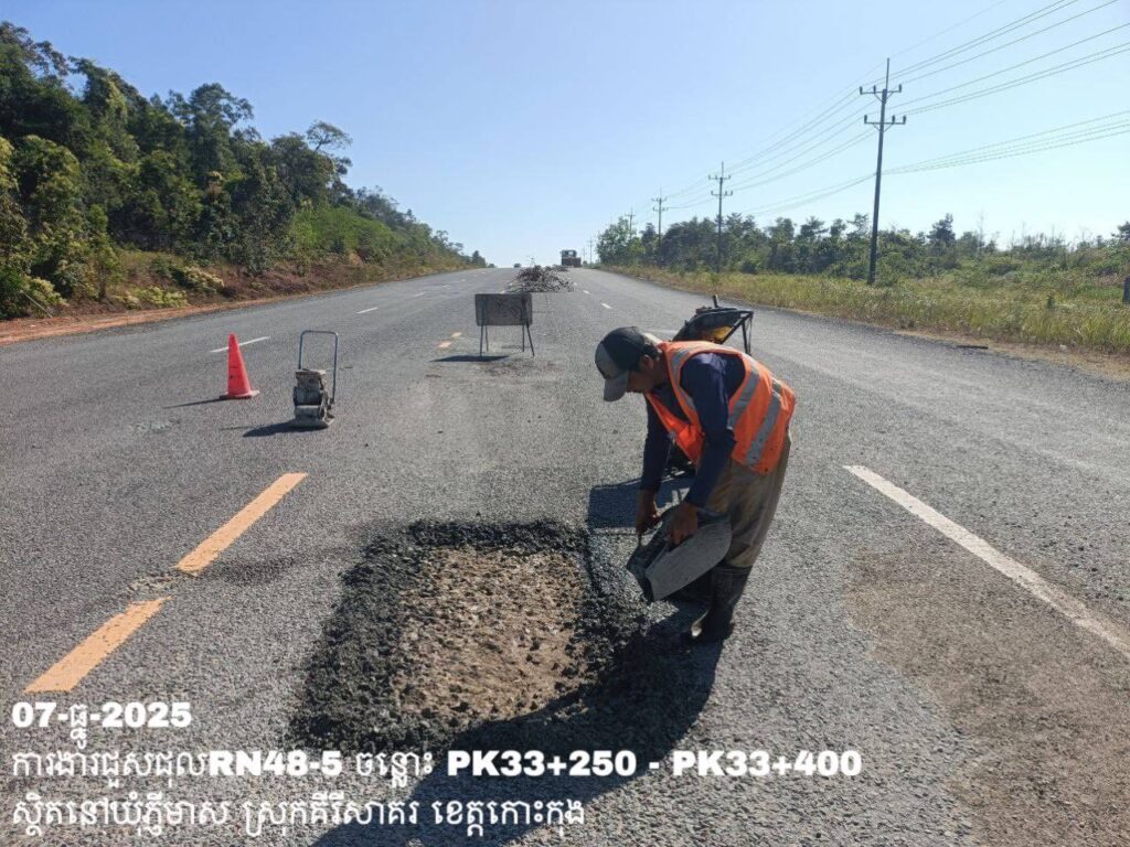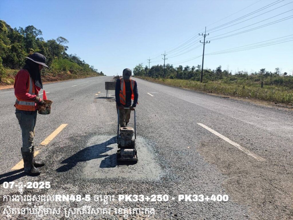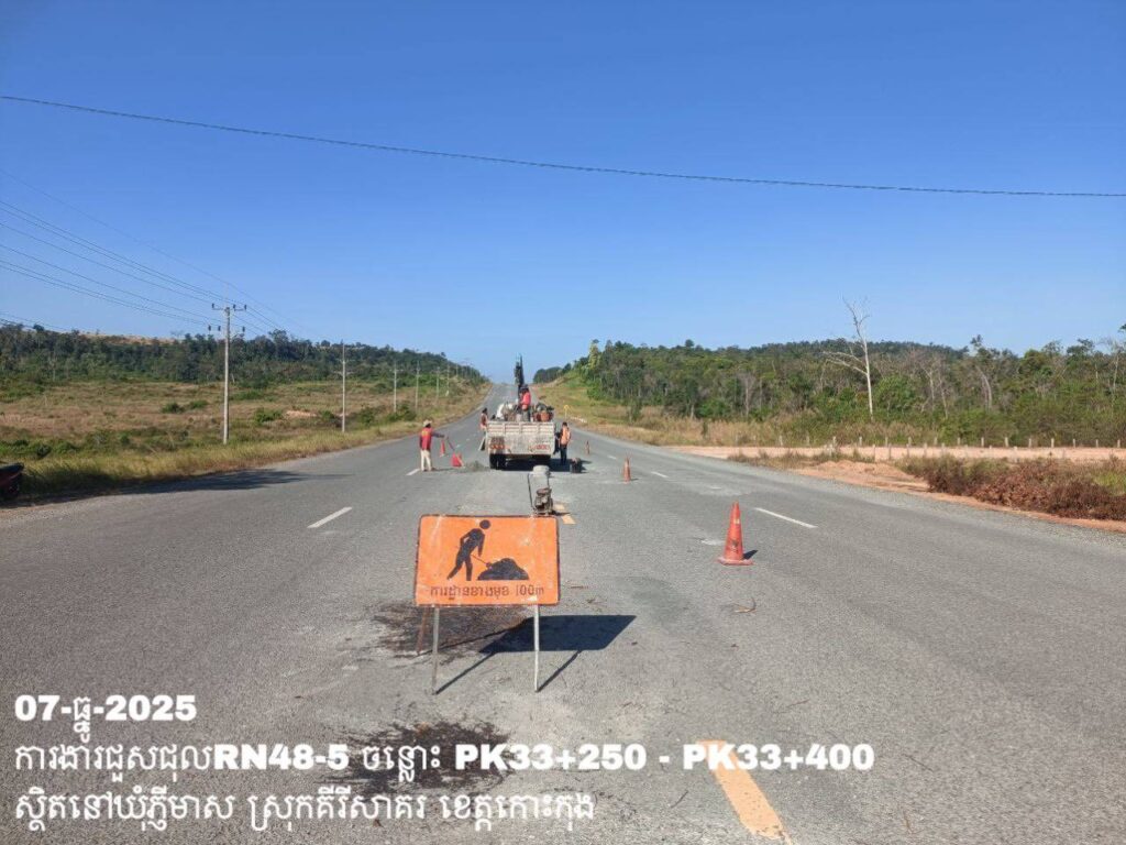 -បន្តការងារថែទាំប្រចាំលើផ្លូវជាតិលេខ 48-5 ឃុំភ្ញីមាស ស្រុកគីរីសាគរ ខេត្តកោះកុង សកម្មភាពការងារជួសជុលសំបុកមាន់ដោយប្រើល្បាយថ្មម៉ិច ជាមួយស៉ីម៉ង់ត៍ និងកៅស៊ូ CRS-2 ត្រង់ចន្លោះ PK33+250 – PK33+400។