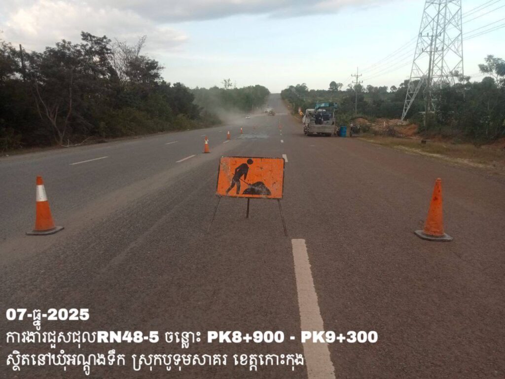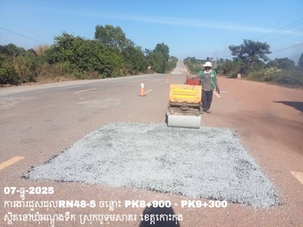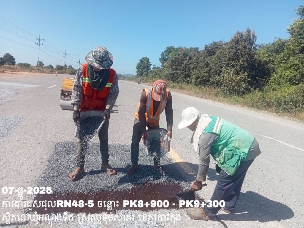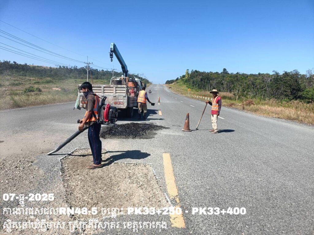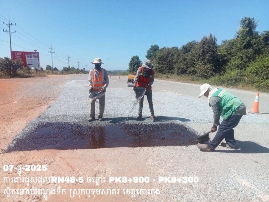 -បន្តការងារថែទាំប្រចាំលើផ្លូវជាតិលេខ 48-5 ឃុំភ្ញីមាស ស្រុកគីរីសាគរ ខេត្តកោះកុង សកម្មភាពការងារជួសជុលសំបុកមាន់ដោយប្រើល្បាយថ្មម៉ិច ជាមួយស៉ីម៉ង់ត៍ និងកៅស៊ូ CRS-2 ត្រង់ចន្លោះ PK33+250 – PK33+400។