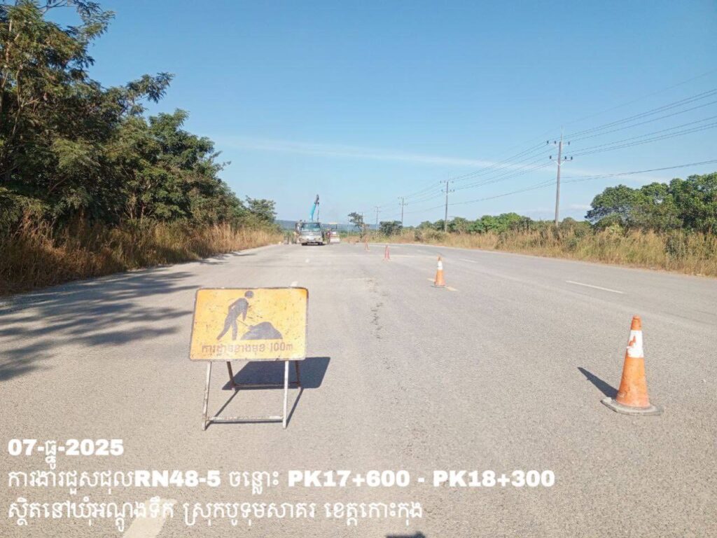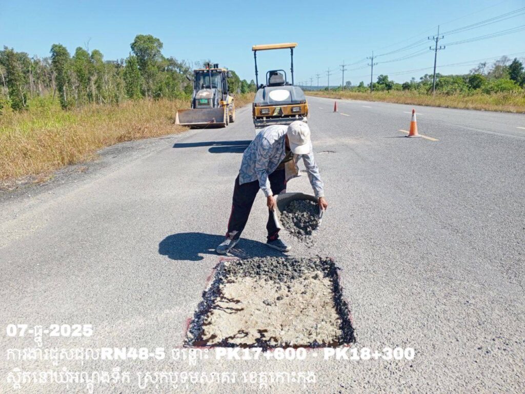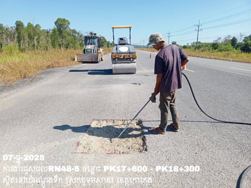-បន្តការងារថែទាំប្រចាំលើផ្លូវជាតិលេខ 48-5 ឃុំអណ្ដូងទឹក ស្រុកបូទុមសាគរ ខេត្តកោះកុង សកម្មភាពការងារជួសជុលសំបុកមាន់ដោយប្រើល្បាយថ្មម៉ិច ជាមួយស៉ីម៉ង់ត៍ និងកៅស៊ូ CRS-2 ត្រង់ចន្លោះ PK17+600 – PK18+300។