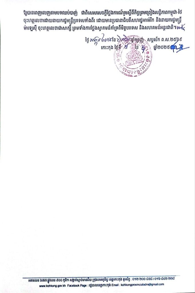 រដ្ឋបាលខេត្តកោះកុង សូមថ្លែងអំណរគុណចំពោះ លោក វ៉ើ ដាយ៉ា និងភរិយា ព្រមទាំងបុត្រ ដែលបានឧបត្ថម្ភថវិកាចំនួន ១០០ ០០០រៀល ដើម្បីរួមចំណែកដោះស្រាយការលំបាករបស់កងកម្លាំងដែលបំពេញកាតព្វកិច្ចប្រចាំការនៅតាមបន្ទាត់ព្រំដែន និងត្រៀមលក្ខណៈដឹកជញ្ជូនប្រជាជន ផ្គត់ផ្គង់គ្រឿងឧបភោគបរិភោគ ព្រមទាំងដើម្បីរៀបចំទីជម្រកសុវត្ថិភាព ជូនប្រជាជនភៀសសឹក