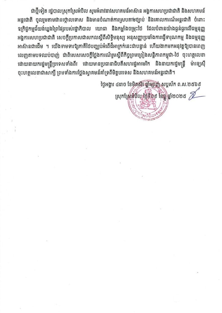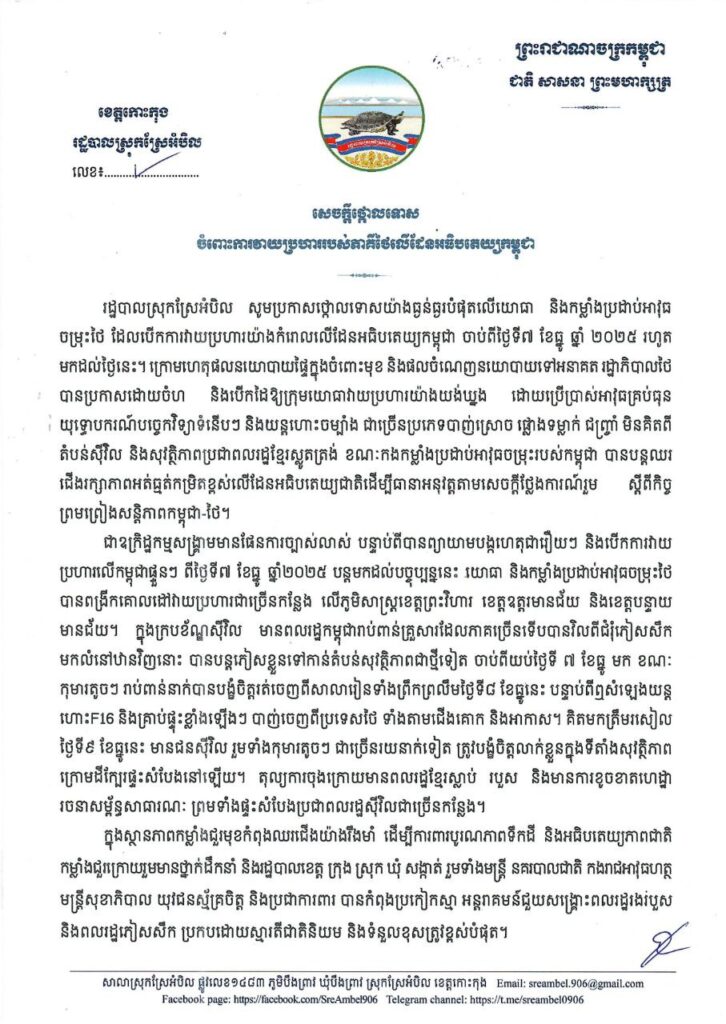 សេចក្តីថ្កោលទោស របស់រដ្ឋបាលស្រុកស្រែអំបិល ចំពោះការវាយប្រហាររបស់ភាគីថៃ លើដែនអធិបតេយ្យកម្ពុជា