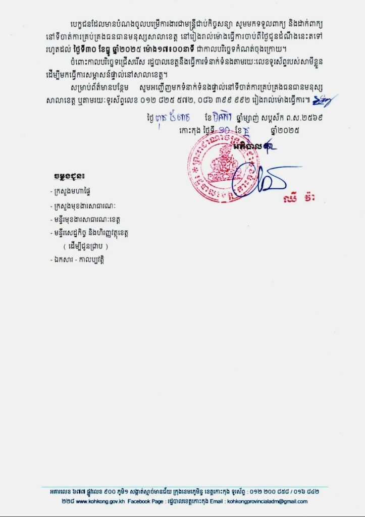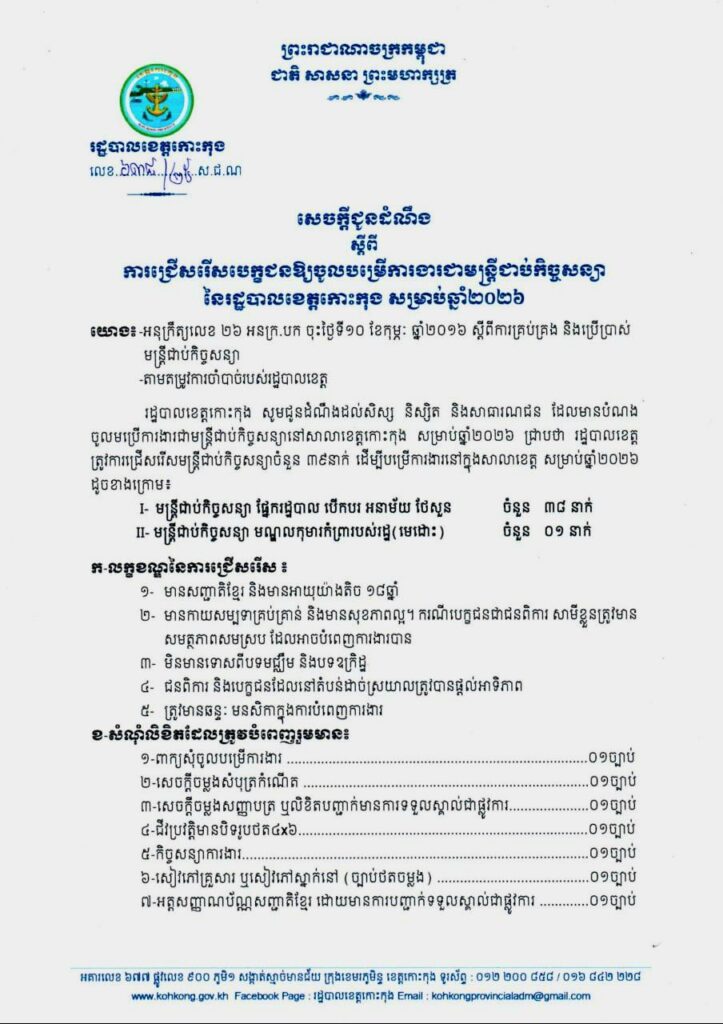សេចក្តីជូនដំណឹង ស្តីពីការជ្រើសរើសបេក្ខជនឱ្យចូលបម្រើការងារជាមន្ត្រីជាប់កិច្ចសន្យា នៃរដ្ឋបាលខេត្តកោះកុង សម្រាប់ឆ្នាំ២០២៦