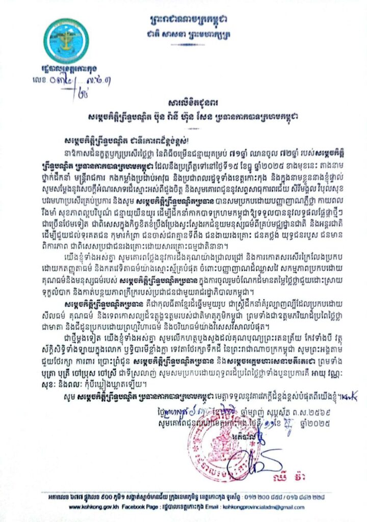 សារលិខិតជូនពរ សម្តេចកិត្តិព្រឹទ្ធបណ្ឌិត ប៊ុន រ៉ានី ហ៊ុន សែន ប្រធានកាកបាទក្រហមកម្ពុជា