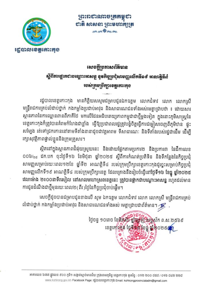 សេចក្ដីប្រកាសព័ត៌មាន ស្ដីពីការផ្អាកជាបណ្ដោះអាសន្ន នូវកិច្ចប្រជុំសាមញ្ញលើកទី១៩ អាណត្តិទី៤ របស់ក្រុមប្រឹក្សាខេត្តកោះកុង