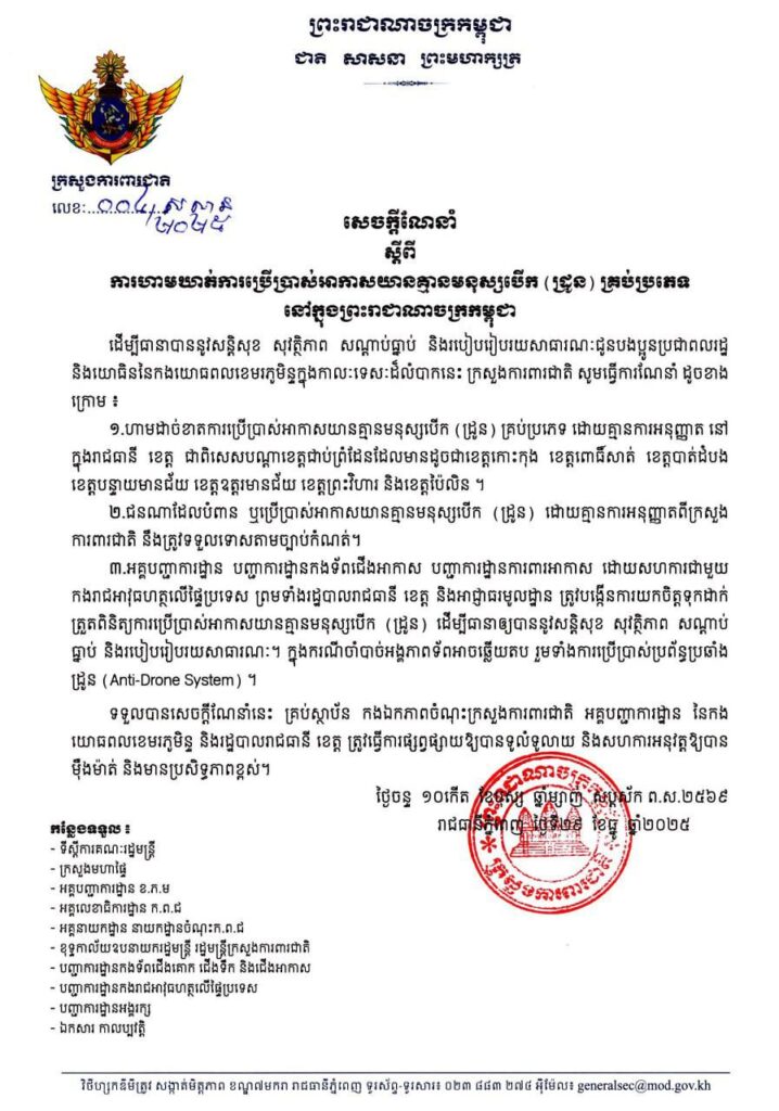 ក្រសួងការពារជាតិ បានចេញសេចក្ដីណែនាំរឹងបន្ដឹង និងហាមឃាត់ការប្រើប្រាស់អាកាសយានគ្មានមនុស្សបើក(ដ្រូន) ដោយគ្មានការអនុញ្ញាតគ្រប់ប្រភេទនៅទូទាំងប្រទេស ជាពិសេសតាមបណ្តាខេត្តជាប់ព្រំដែន