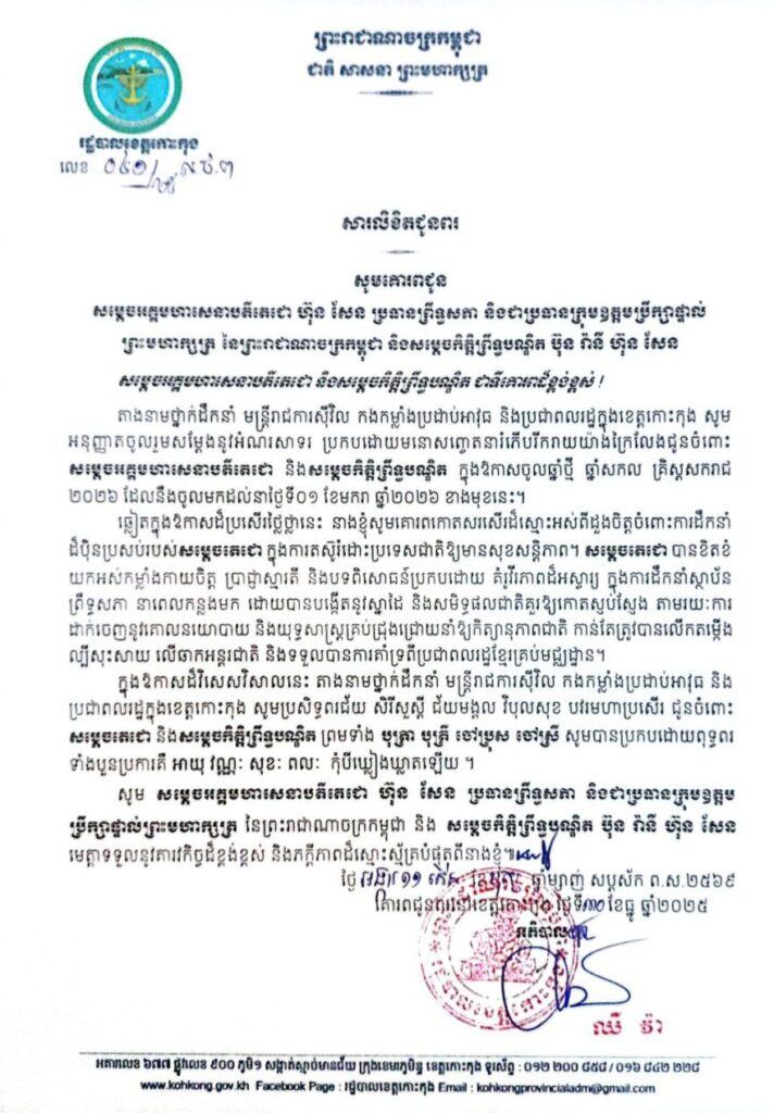 សារលិខិតជូនពរ សូមគោរពជូន សម្តេចអគ្គមហាសេនាបតីតេជោ ហ៊ុន សែន ប្រធានព្រឹទ្ធសភា និងជាប្រធានក្រុមឧត្តមប្រឹក្សាផ្ទាល់ ព្រះមហាក្សត្រ នៃព្រះរាជាណាចក្រកម្ពុជា និងសម្តេចកិត្តិព្រឹទ្ធបណ្ឌិត ប៊ុន រ៉ានី ហ៊ុន សែន ក្នុងឱកាសចូលឆ្នាំថ្មី ឆ្នាំសកល គ្រិស្តសករាជ ២០២៦