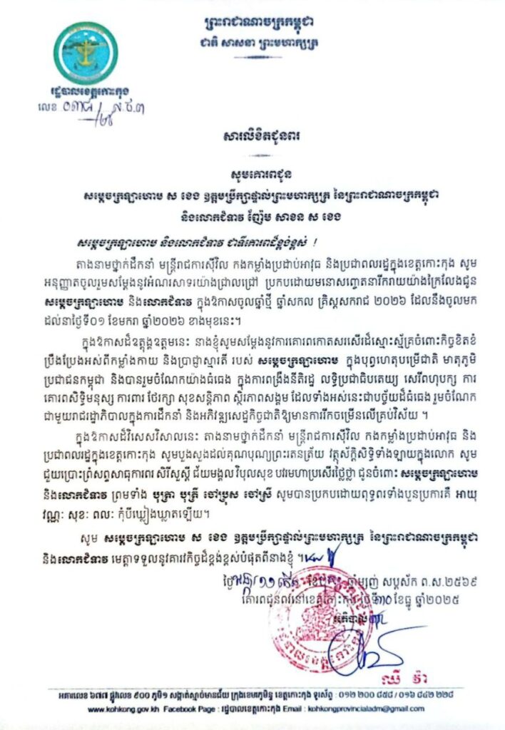 សារលិខិតជូនពរ សូមគោរពជូន សម្តេចក្រឡាហោម ស ខេង ឧត្តមប្រឹក្សាផ្ទាល់ព្រះមហាក្សត្រ នៃព្រះរាជាណាចក្រកម្ពុជា និងលោកជំទាវ ញ៉ែម សាខន ស ខេង ក្នុងឱកាសចូលឆ្នាំថ្មី ឆ្នាំសកល គ្រិស្តសករាជ ២០២៦