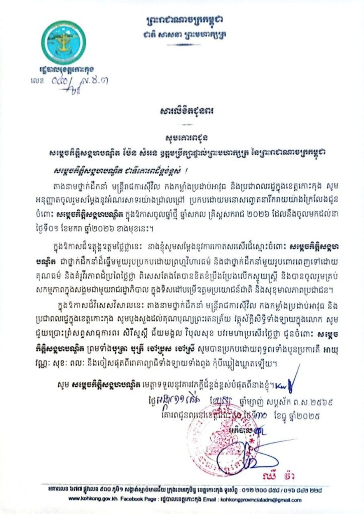 សារលិខិតជូនពរ សូមគោរពជូន សម្តេចកិត្តិសង្គហបណ្ឌិត ម៉ែន សំអន ឧត្តមប្រឹក្សាផ្ទាល់ព្រះមហាក្សត្រ នៃព្រះរាជាណាចក្រកម្ពុជា ក្នុងឱកាសចូលឆ្នាំថ្មី ឆ្នាំសកល គ្រិស្តសករាជ ២០២៦