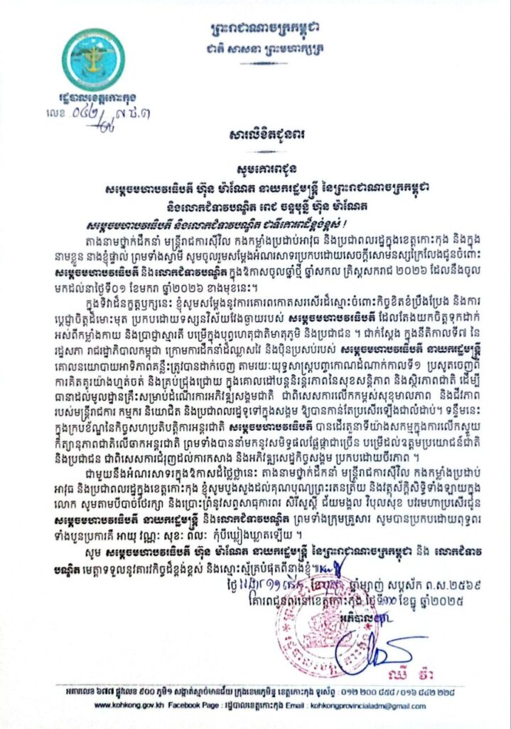 សារលិខិតជូនពរ សូមគោរពជូន សម្តេចមហាបវរធិបតី ហ៊ុន ម៉ាណែត នាយករដ្ឋមន្ត្រី នៃព្រះរាជាណាចក្រកម្ពុជា និងលោកជំទាវបណ្ឌិត ពេជ ចន្ទមុន្នី ហ៊ុន ម៉ាណែត ក្នុងឱកាសចូលឆ្នាំថ្មី ឆ្នាំសកល គ្រិស្តសករាជ ២០២៦