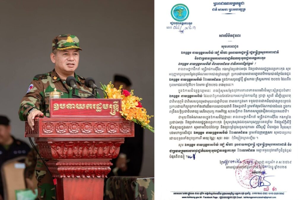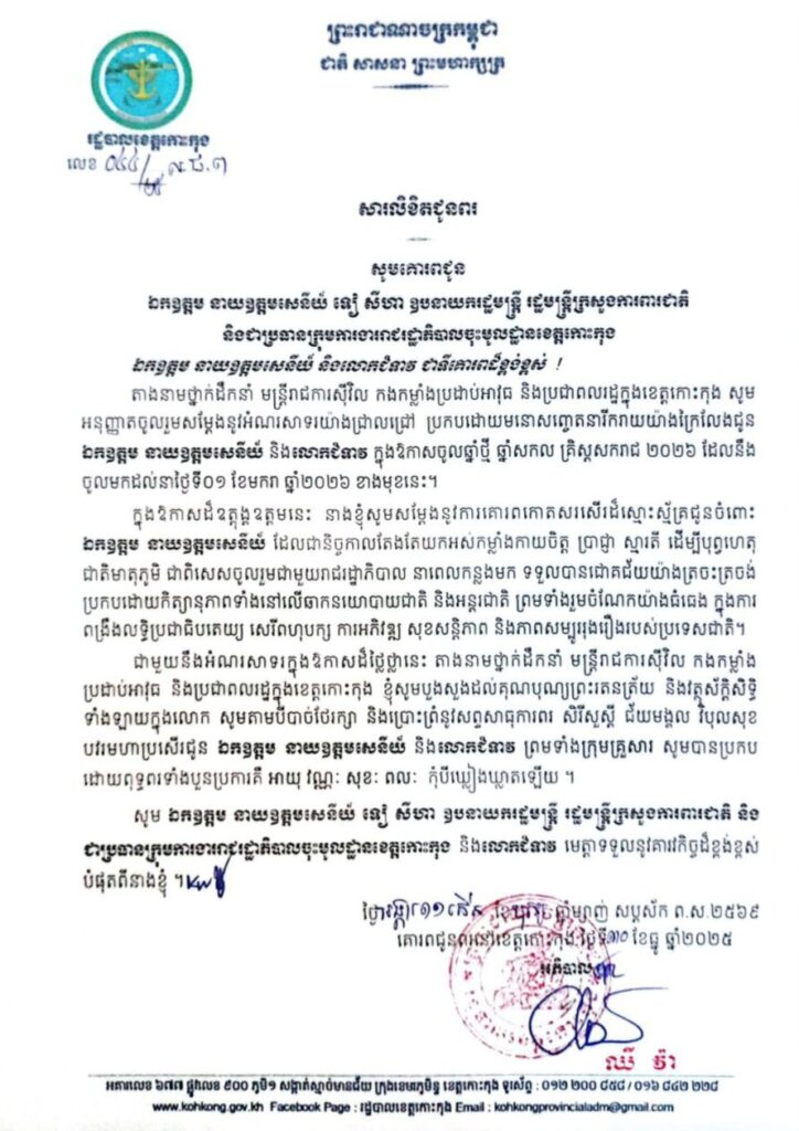 សារលិខិតជូនពរ សូមគោរពជូន ឯកឧត្តម នាយឧត្តមសេនីយ៍ ទៀ សីហា ឧបនាយករដ្ឋមន្ត្រី រដ្ឋមន្ត្រីក្រសួងការពារជាតិ និងជាប្រធានក្រុមការងាររាជរដ្ឋាភិបាលចុះមូលដ្ឋានខេត្តកោះកុង ក្នុងឱកាសចូលឆ្នាំថ្មី ឆ្នាំសកល គ្រិស្តសករាជ ២០២៦