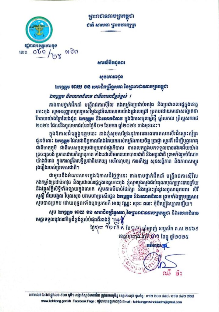 សារលិខិតជូនពរ សូមគោរពជូន ឯកឧត្តម អាយ ខន សមាជិកព្រឹទ្ធសភា នៃព្រះរាជាណាចក្រកម្ពុជា ក្នុងឱកាសចូលឆ្នាំថ្មី ឆ្នាំសកល គ្រិស្តសករាជ ២០២៦