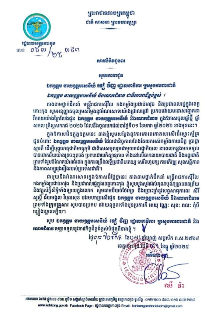 សារលិខិតជូនពរ សូមគោរពជូន ឯកឧត្តម នាយឧត្តមសេនីយ៍ ទៀ វិញ រដ្ឋលេខាធិការ ក្រសួងការពារជាតិ ក្នុងឱកាសចូលឆ្នាំថ្មី ឆ្នាំសកល គ្រិស្តសករាជ ២០២៦