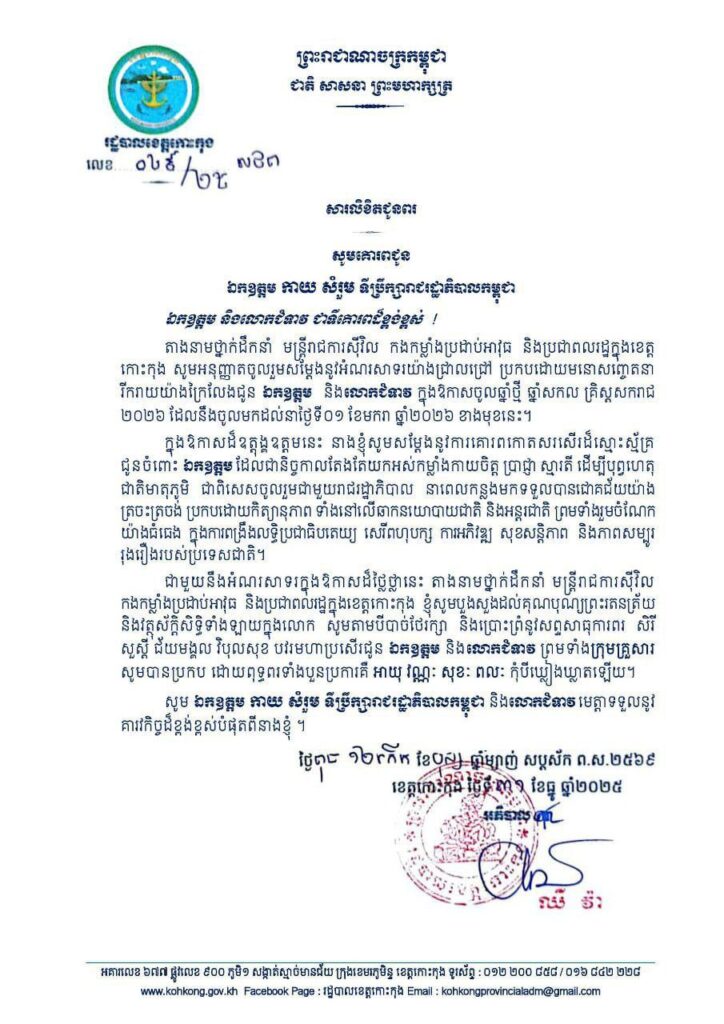 សារលិខិតជូនពរ សូមគោរពជូន ឯកឧត្ដម កាយ សំរួម ទីប្រឹក្សារាជរដ្ឋាភិបាលកម្ពុជា ក្នុងឱកាសចូលឆ្នាំថ្មី ឆ្នាំសកល គ្រិស្ដសករាជ ២០២៦