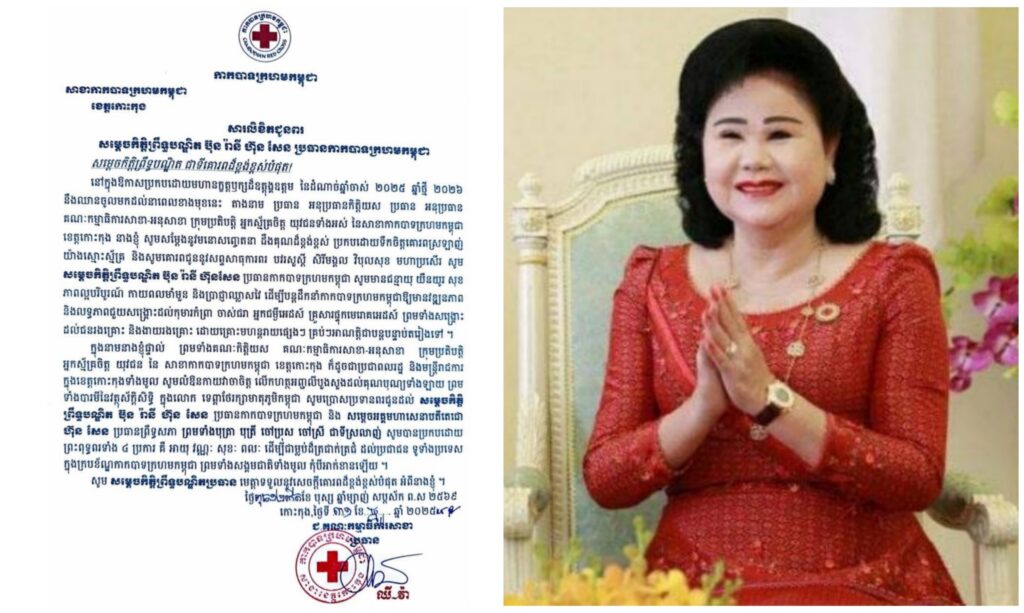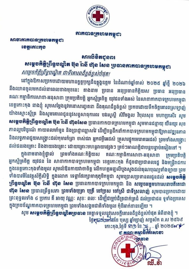 សារលិខិតជូនពរ សម្តេចកិត្តិព្រឹទ្ធបណ្ឌិត ប៊ុន រ៉ានី ហ៊ុន សែន ប្រធានកាកបាទក្រហមកម្ពុជា ក្នុងឱកាសប្រកបដោយមហានក្ខត្តឫក្សដ៏ឧត្តុង្គឧត្តម នៃដំណាច់ឆ្នាំចាស់ ២០២៥ ឆ្នាំថ្មី ២០២៦