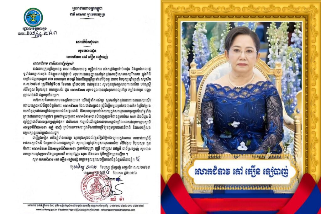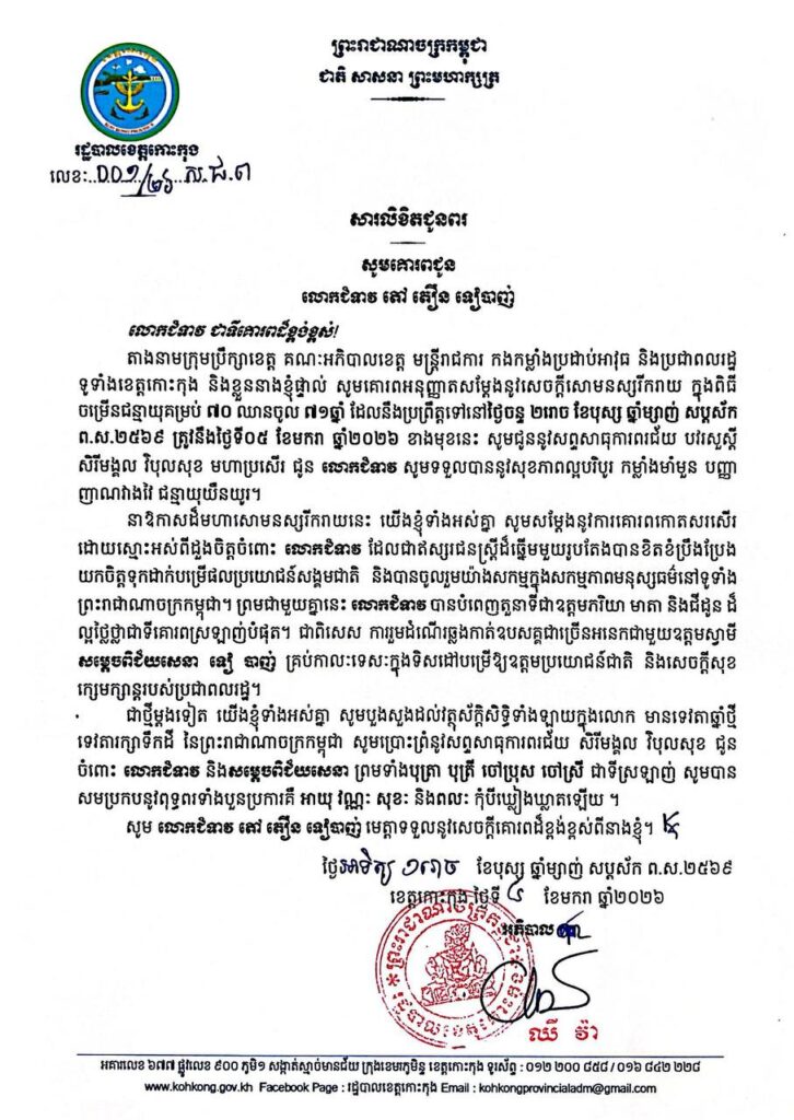 សារលិខិតជូនពរ សូមគោរពជូន លោកជំទាវ តៅ តឿន ទៀបាញ់ ក្នុងពិធីចម្រើនជន្មាយុគម្រប់ ៧០ ឈានចូល ៧១ឆ្នាំ