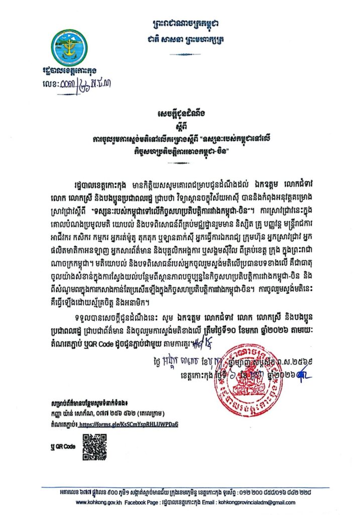 សេចក្តីជូនដំណឹង ស្តីពីការចូលរួមការស្ទង់មតិទៅលើគម្រោងស្តីពី “ទស្សនៈរបស់កម្ពុជាទៅលើ កិច្ចសហប្រតិបត្តិការរវាងកម្ពុជា-ចិន”