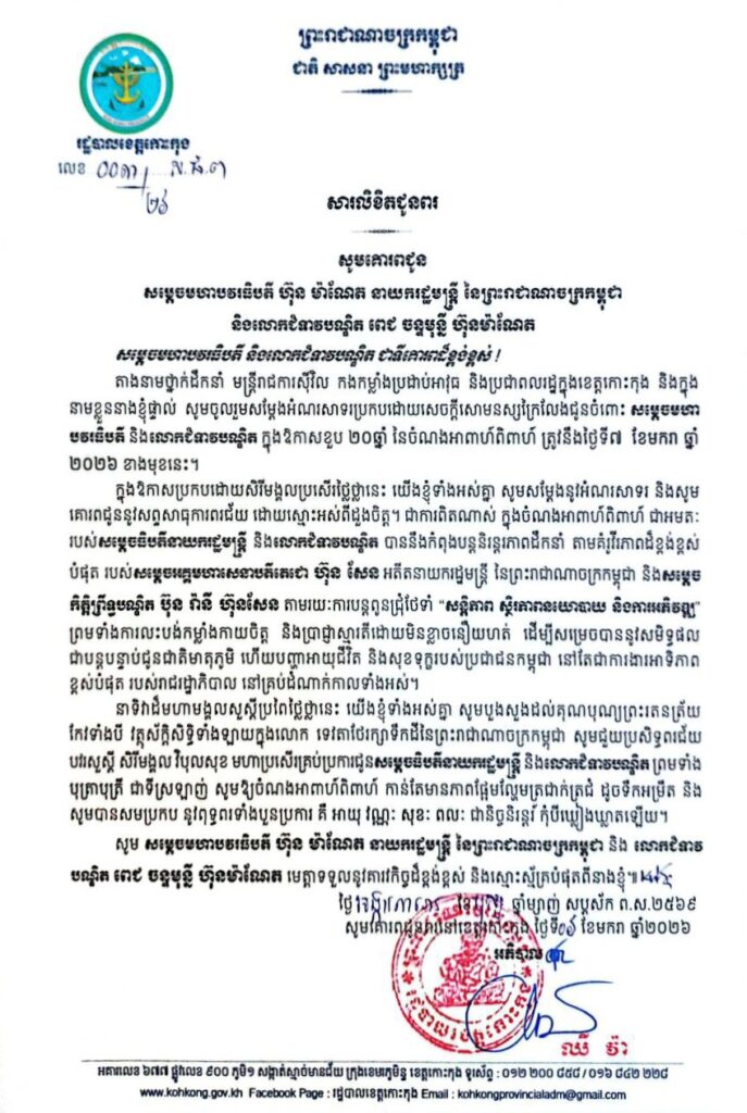 សារលិខិតជូនពរ សូមគោរពជូន សម្តេចមហាបវរធិបតី ហ៊ុន ម៉ាណែត នាយករដ្ឋមន្ត្រី នៃព្រះរាជាណាចក្រកម្ពុជា និងលោកជំទាវបណ្ឌិត ពេជ ចន្ទមុន្នី ហ៊ុនម៉ាណែត ក្នុងឱកាសខួប ២០ឆ្នាំ នៃចំណងអាពាហ៍ពិពាហ៍ ត្រូវនឹងថ្ងៃទី៧ ខែមករា ឆ្នាំ ២០២៦ ខាងមុខនេះ