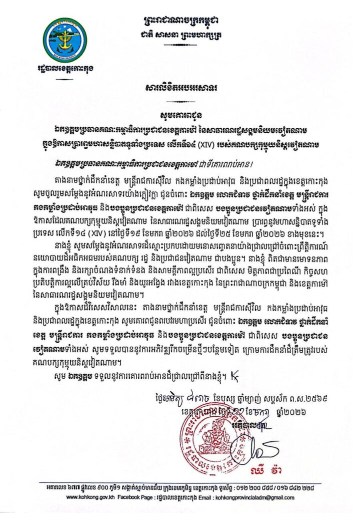 សារលិខិតអបអរសាទរ សូមគោរពជូន ឯកឧត្តមប្រធានគណៈកម្មាធិការប្រជាជនខេត្តកាម៉ៅ នៃសាធារណរដ្ឋសង្គមនិយមវៀតណាម ក្នុងឱកាសប្រារព្ធមហាសន្និបាតទូទាំងប្រទេស លើកទី១៤ (XIV) របស់គណបក្សកុម្មុយនិស្តវៀតណាម