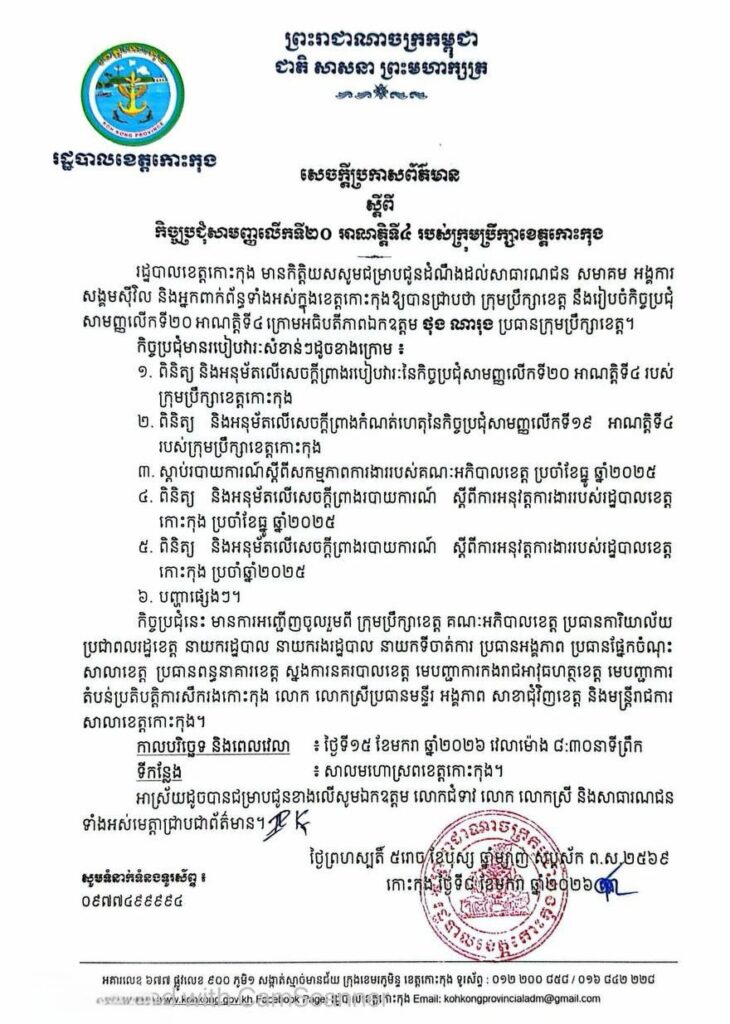 សេចក្តីប្រកាសព័ត៌មាន ស្តីពីកិច្ចប្រជុំសាមញ្ញលើកទី២០ អាណត្តិទី៤ របស់ក្រុមប្រឹក្សាខេត្តកោះកុង