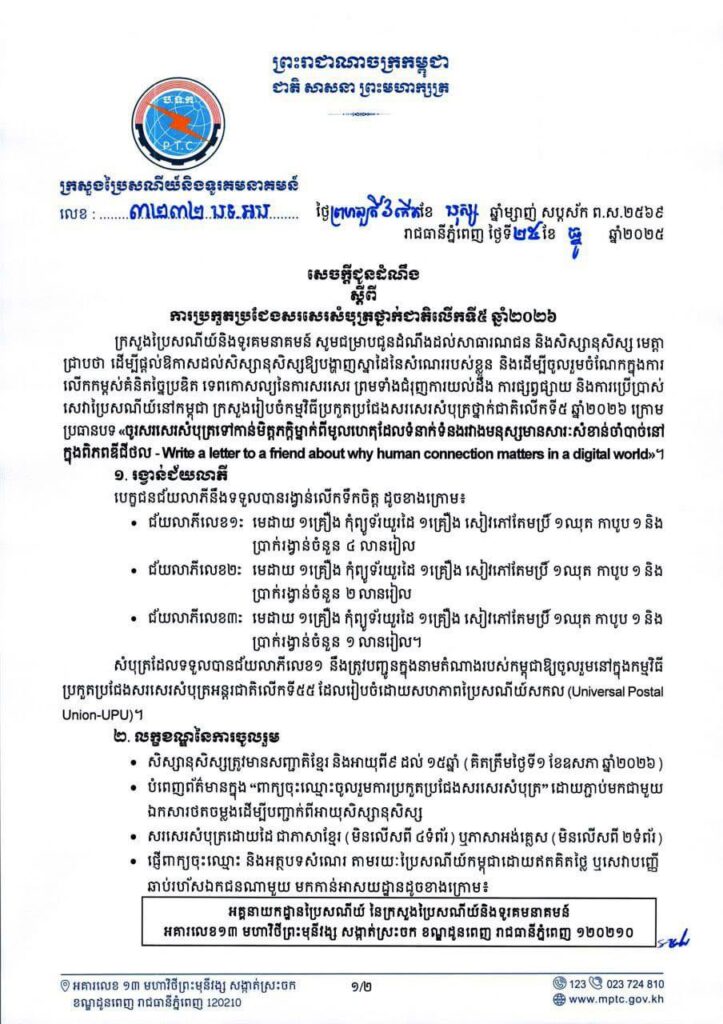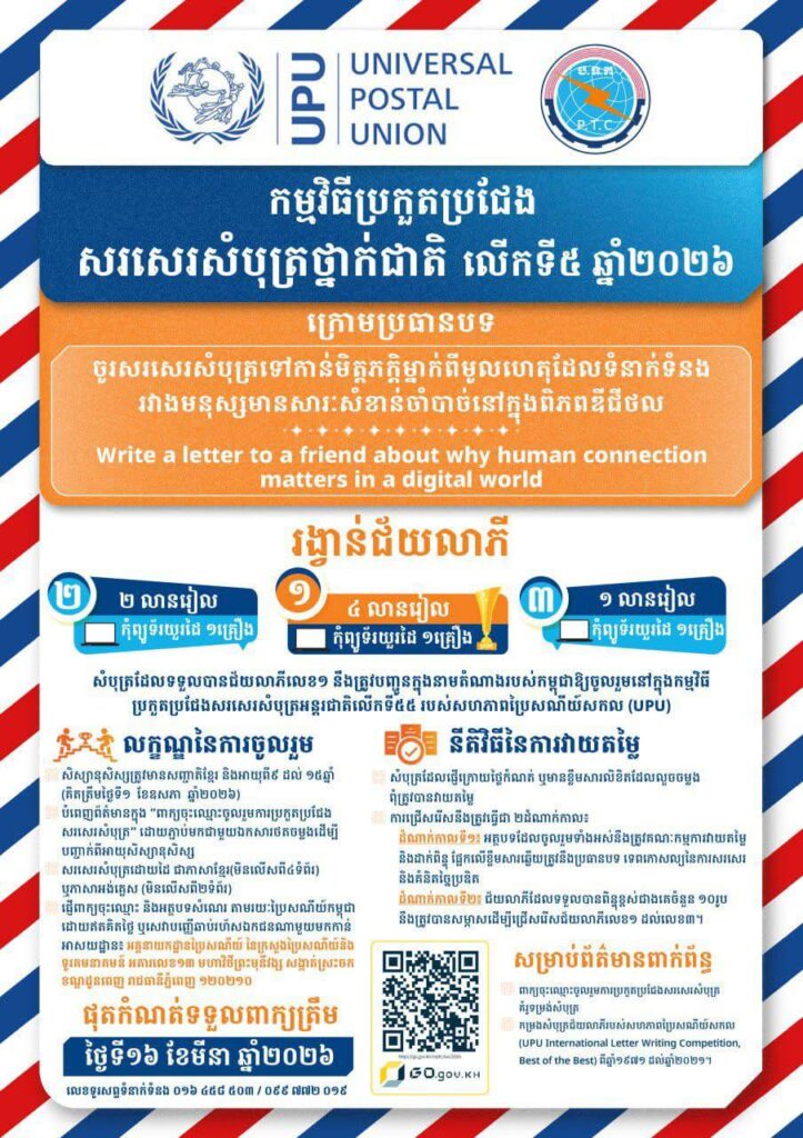 លោក-លោកស្រីប្រធាន-អនុការិយាល័យជំនាញមន្ទីរប្រៃសណីយ៍និងទូរគមនាគមន៍ខេត្តកោះកុង បានចុះផ្សព្វផ្សាយ ស្ដីពីការប្រកួតប្រជែងសរសេរសំបុត្រថ្នាក់ជាតិលើកទី៥ ឆ្នាំ២០២៦ ក្រោមប្រធានបទ«ចូរសរសេរសំបុត្រទៅកាន់មិត្តភក្តិម្នាក់ពីមូលហេតុដែលទំនាក់ទំនងរវាងមនុស្សមានសារៈសំខាន់ចាំបាច់នៅក្នុងពិភពឌីជីថល» ដល់សិស្សានុសិស្សនៅតាមសាលាបឋមសិក្សា, អនុវិទ្យាល័យរដ្ឋ និងឯកជន និងមានកិច្ចសហការបន្ថែមពីលោកប្រធានមន្ទីរអប់រំ យុវជននិងកីឡា ក្នុងការជួយផ្សព្វផ្សាយបន្តតាមគ្រុបតេឡេក្រាមរបស់មន្ទីរបានទៅដល់គ្រប់នាយកសាលា ក្នុងទីរួមខេត្ត និងនៅតាមបណ្ដាស្រុកនានា ដើម្បីឱ្យសិស្សានុសិស្សបានបញ្ចេញស្នាដៃសរសេរសំណេររបស់ខ្លួនក្នុងកម្មវិធីប្រកួតប្រជែងនេះ។