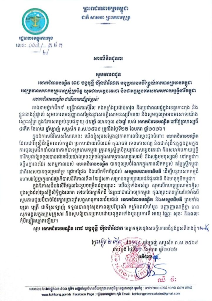 សារលិខិតជូនពរ សូមគោរពជូន លោកជំទាវបណ្ឌិត ពេជ ចន្ទមុន្នី ហ៊ុនម៉ាណែត អនុប្រធានអចិន្ត្រៃយ៍កាកបាទក្រហមកម្ពុជា អនុប្រធានសមាគមគ្រូពេទ្យស្ម័គ្រចិត្ត យុវជនសម្តេចតេជោ និងជាអគ្គស្នងការសមាគមកាយឫទ្ធិនារីកម្ពុជា ក្នុងឱកាសគម្រប់ខួបជន្មាយុ ៤៥ឆ្នាំ ឈានចូល ៤៦ឆ្នាំ របស់ លោកជំទាវបណ្ឌិត នៅថ្ងៃព្រហស្បតិ៍ ៤កើត ខែមាឃ ឆ្នាំម្សាញ់ សប្តស័ក ព.ស.២៥៦៩ ត្រូវនឹងថ្ងៃទី២២ ខែមករា ឆ្នាំ២០២៦