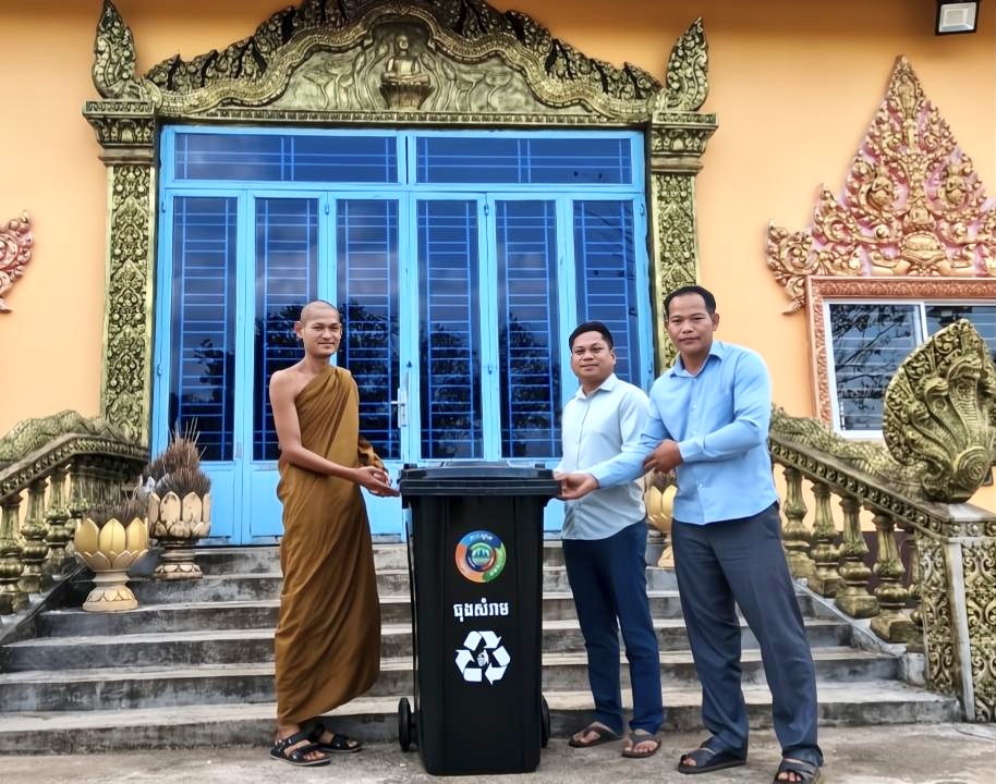 លោក ឈឺន ភស្ដារ អភិបាលរង នៃគណៈអភិបាលស្រុក តំណាងលោកស្រីអភិបាលស្រុក និងមន្រ្តី នៃរដ្ឋបាលស្រុកថ្មបាំង អញ្ជើញនាំយក ធុង សំរាម របស់មន្ទីរបរិស្ថានខេត្តកោះកុង ដើម្បីប្រគេនវត្តព្រះពុទ្ធថ្មបាំង
