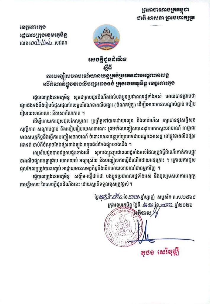 សេចក្តីជូនដំណឹង របស់រដ្ឋបាលក្រុងខេមរភូមិន្ទ ស្ដីពីការបញ្ចៀសចរាចរណ៍យានយន្តគ្រប់ប្រភេទជាបណ្ដោះអាសន្ន នៅផ្លូវខាងលិចផ្សារដងទង់