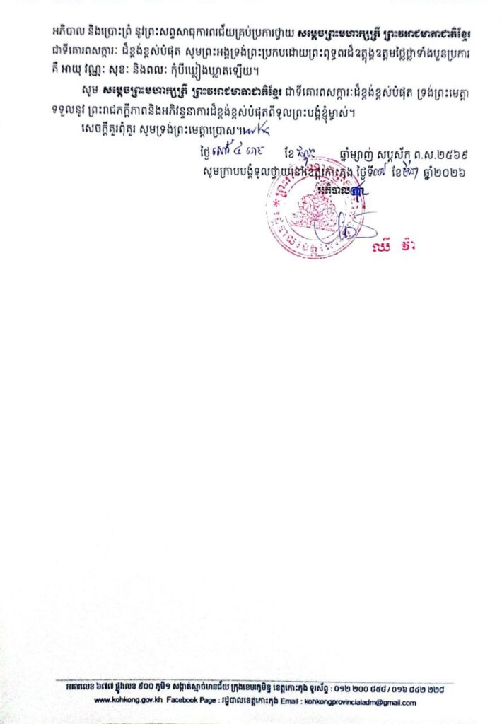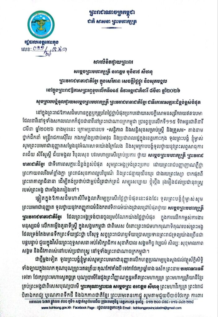 សារលិខិតថ្វាយព្រះពរ សម្តេចព្រះមហាក្សត្រី នរោត្តម មុនិនាថ សីហនុ ព្រះវររាជមាតាជាតិខ្មែរ ក្នុងសេរីភាព សេចក្តីថ្លៃថ្នូរ និងសុភមង្គល នៅក្នុងព្រះរាជឱកាសប្រារព្ធខួបលើកទី១១៥ ទិវាអន្តរជាតិនារី ៨មីនា ឆ្នាំ២០២៦