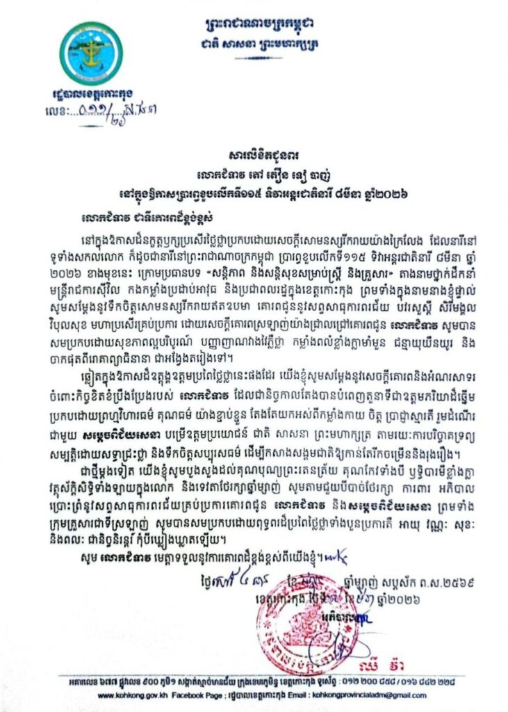 សារលិខិតជូនពរ លោកជំទាវកិត្តិបណ្ឌិត អ៉ឹង កន្ថាផាវី រដ្ឋមន្ត្រីក្រសួងកិច្ចការនារី នៅក្នុងឱកាសប្រារព្ធខួបលើកទី១១៥ ទិវាអន្តរជាតិនារី ៨មីនា ឆ្នាំ២០២៦