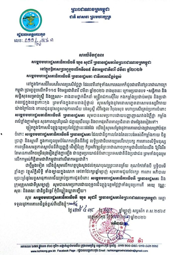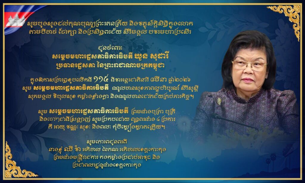 សារលិខិតជូនពរ សម្តេចមហារដ្ឋសភាធិការធិបតី ឃួន សុដារី ប្រធានរដ្ឋសភានៃព្រះរាជាណាចក្រកម្ពុជា នៅក្នុងឱកាសប្រារព្ធខួបលើកទី១១៥ ទិវាអន្តរជាតិនារី ៨មីនា ឆ្នាំ២០២៦