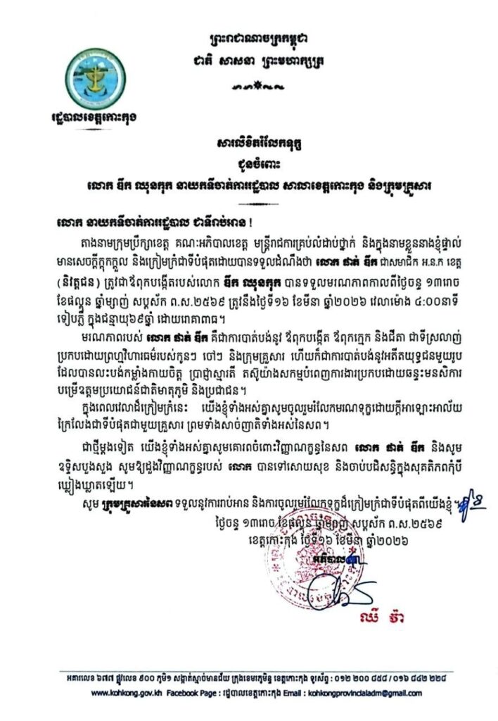 សារលិខិតរំលែកទុក្ខ ជូនចំពោះលោក ឌឹក ឈុនកុក នាយកទីចាត់ការរដ្ឋបាល សាលាខេត្តកោះកុង និងក្រុមគ្រួសារ