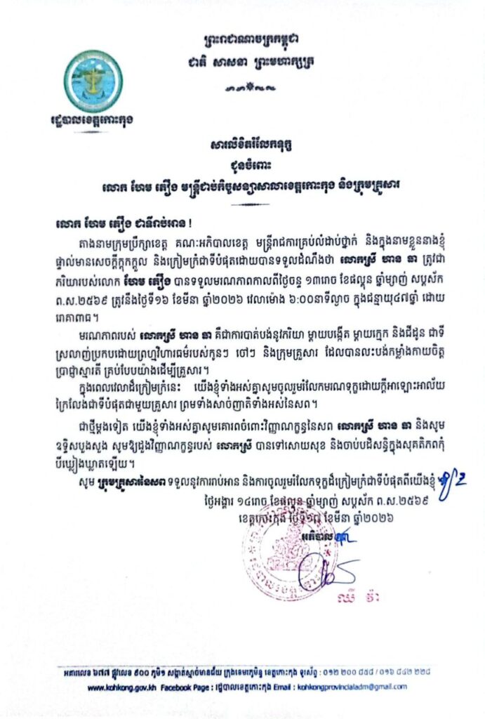 សារលិខិតរំលែកទុក្ខ ជូនចំពោះ លោក ហែម ភឿង មន្ត្រីជាប់កិច្ចសន្យាសាលាខេត្តកោះកុង និងក្រុមគ្រួសារ