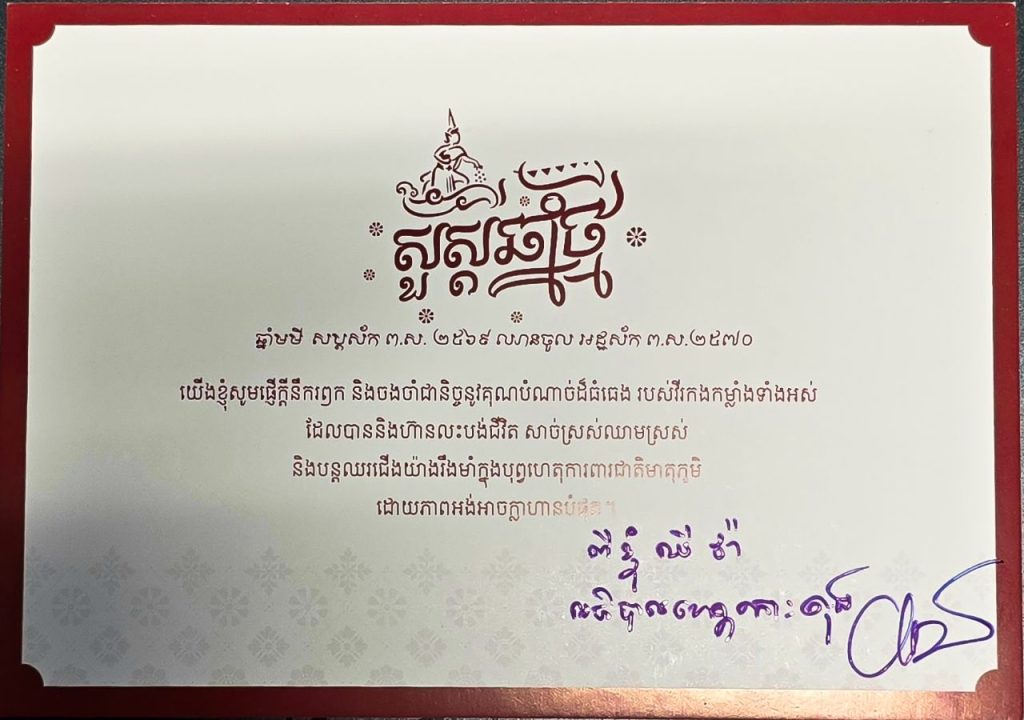 ក្នុងឱកាសបុណ្យចូលឆ្នាំថ្មី ប្រពៃណីជាតិខ្មែរ ឆ្នាំមមី សប្តស័ក ពុទ្ធសករាជ ២៥៦៩ ឈានចូល អដ្ឋស័ក ពុទ្ធសករាជ ២៥៧០យើងខ្ញុំសូមផ្ញើក្តីនឹករឭក និងចងចាំជានិច្ចនូវគុណបំណាច់ដ៏ធំធេង របស់វីរកងកម្លាំងទាំងអស់ ដែលបាននិងហ៊ានលះបង់ជីវិត សាច់ស្រស់ឈាមស្រស់ និងបន្តឈរជើងយ៉ាងរឹងមាំក្នុងបុព្វហេតុការពារជាតិមាតុភូមិ ដោយភាពអង់អាចក្លាហានបំផុត ! ពីខ្ញុំ ឈី វ៉ា អភិបាល នៃគណៈអភិបាលខេត្តកោះកុង