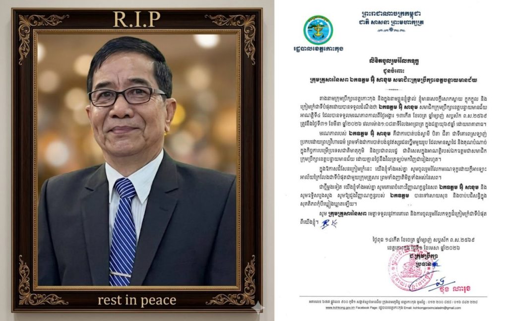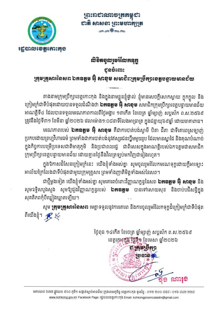 ក្រុមប្រឹក្សាខេត្តកោះកុង សូមចូលរួមរំលែកទុក្ខដ៏ក្រៀមក្រំ ជាមួយក្រុមគ្រួសារនៃសព ឯកឧត្ដម អ៊ុំ សាខុម សមាជិកក្រុមប្រឹក្សាខេត្តបន្ទាយមានជ័យ