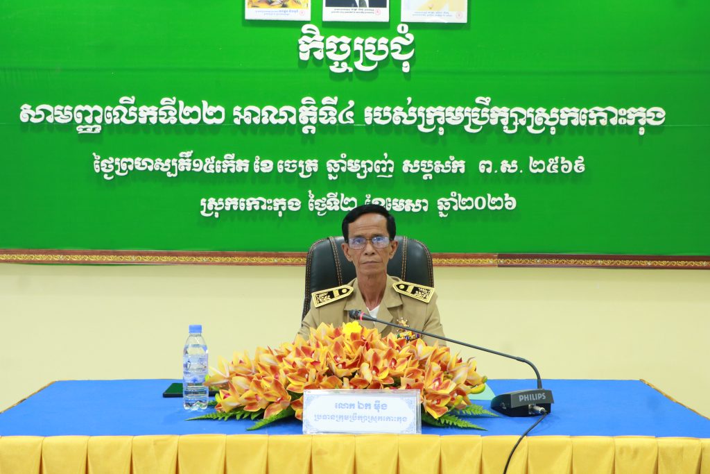 ស្រុកកោះកុង ៖ រសៀលថ្ងៃទី២ ខែមេសា ឆ្នាំ២០២៦ ក្រុមប្រឹក្សាស្រុកកោះកុង បានបើកកិច្ចប្រជុំសាមញ្ញលើកទី២២ អាណត្ដិទី៤ ក្រោមអធិបតីភាព លោក ឯក ម៉ឹង ប្រធានក្រុមប្រឹក្សាស្រុកកោះកុង ដើម្បីពិនិត្យ និងអនុម័តលើកាងារសំខាន់ៗ មួយចំនួន និងកិច្ចការអនុវត្តបន្ត របស់រដ្ឋបាលស្រុកកោះកុង នៅសាលប្រជុំសាលាស្រុកកោះកុង។