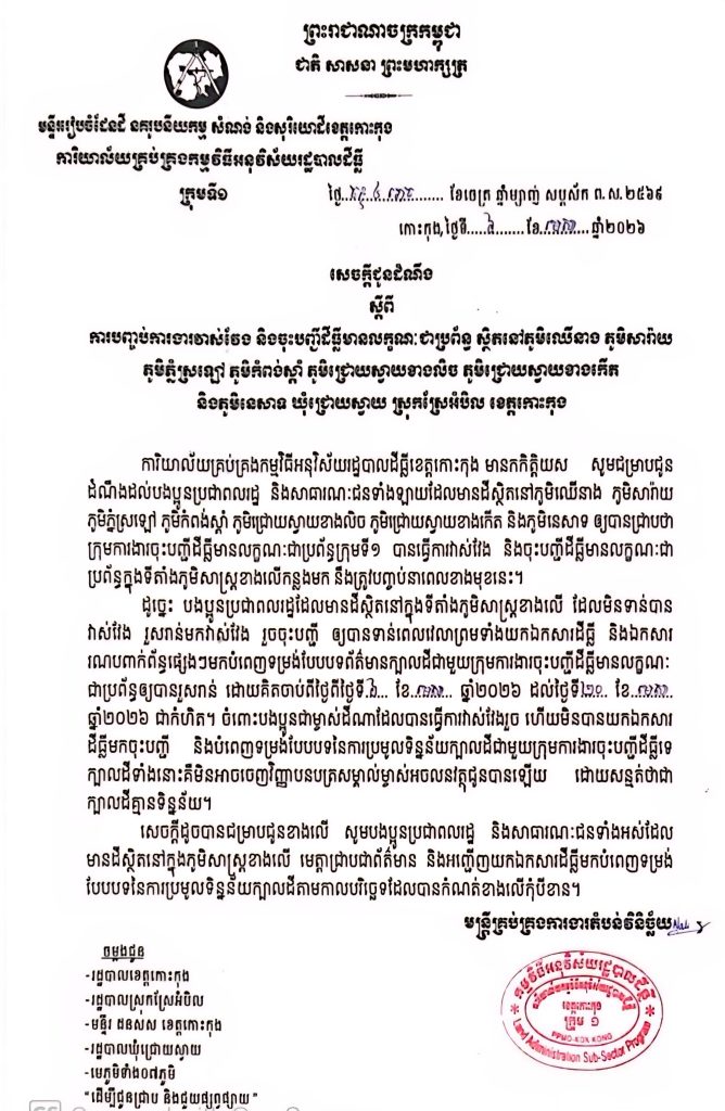 សេចក្តីជូនដំណឹង ស្តីពីការបញ្ចប់ការងារចាស់វែង និងចុះបញ្ជីដីធ្លីមានលក្ខណៈជាប្រព័ន្ធ ស្ថិតនៅភូមិឈើនាង ភូមិសារ៉ាយ ភូមិភ្នំស្រឡៅ ភូមិកំពង់ស្តាំ ភូមិជ្រោយស្វាយខាងលិច ភូមិជ្រោយស្វាយខាងកើត និងភូមិនេសាទ ឃុំជ្រោយស្វាយ ស្រុកស្រែអំបិល ខេត្តកោះកុង។