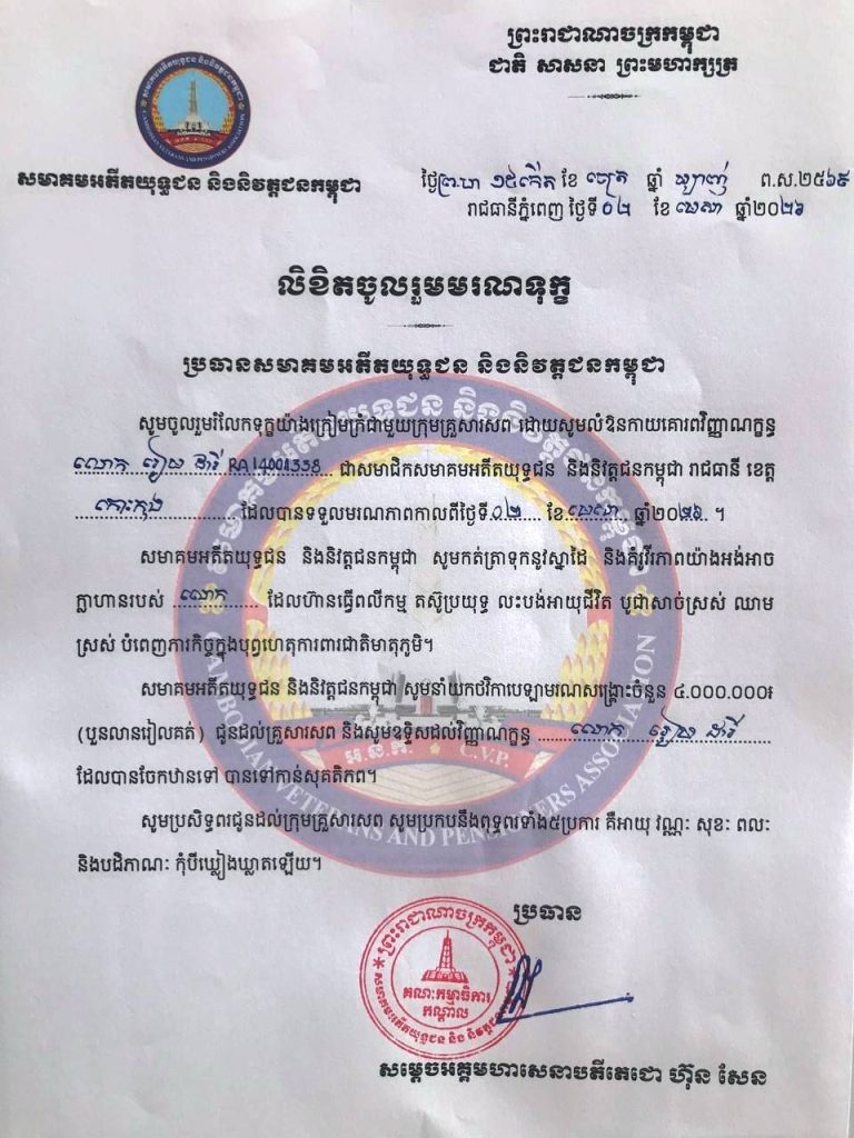 ប្រធានសមាគមអតីតយុទ្ធជន និងនិវត្តជនកម្ពុជា សូមចូលរួមរំលែកទុក្ខយ៉ាងក្រៀមក្រំជាមួយក្រុមគ្រួសារសព ដោយសូមលំឱនកាយគោរពវិញ្ញាណក្ខន្ធ លោក រៀម ដារី ជាសមាជិកសមាគមអតីតយុទ្ធជន និងនិវត្តជនកម្ពុជា ខេត្តកោះកុង។