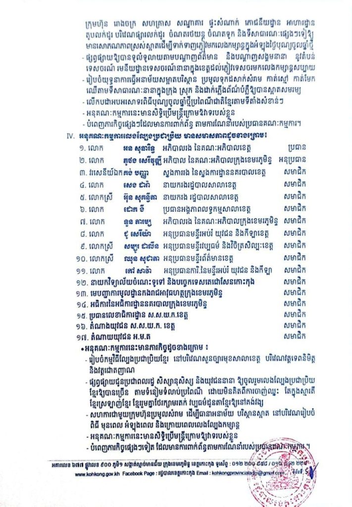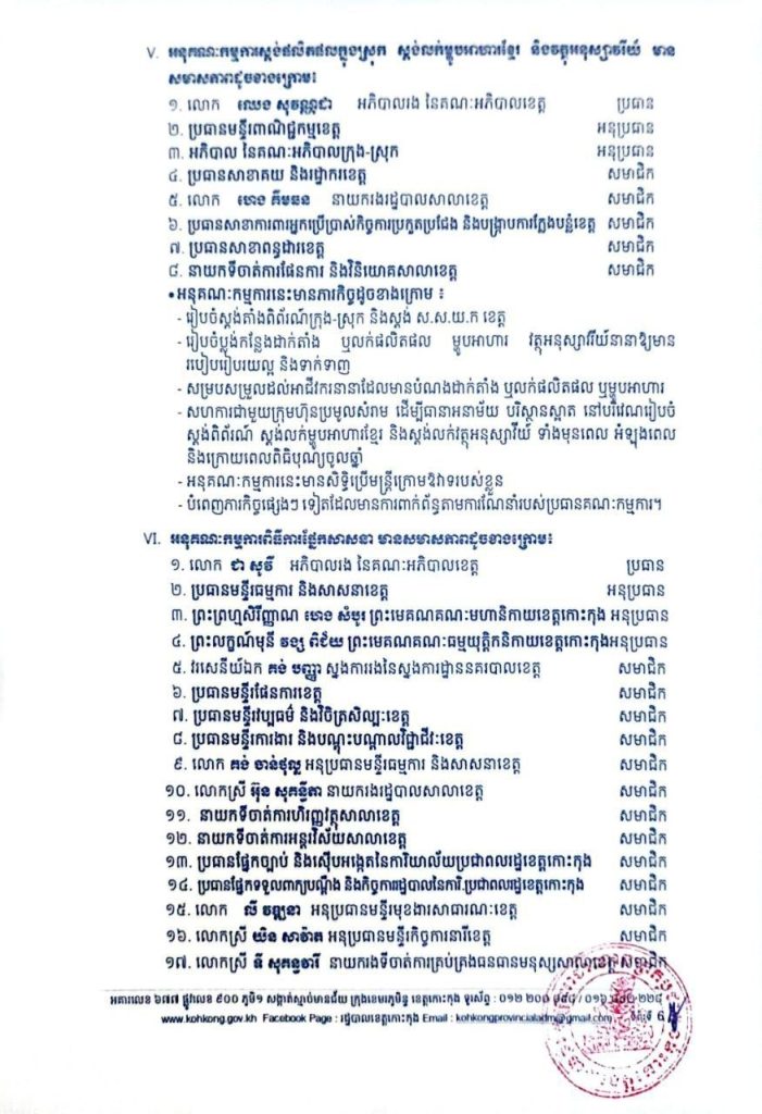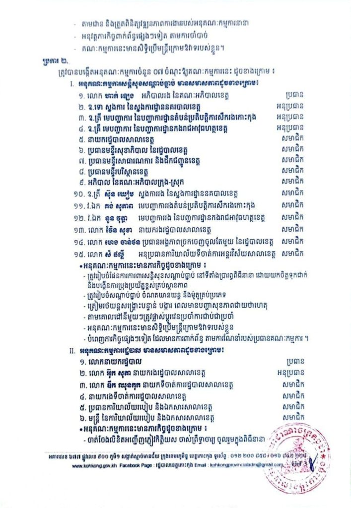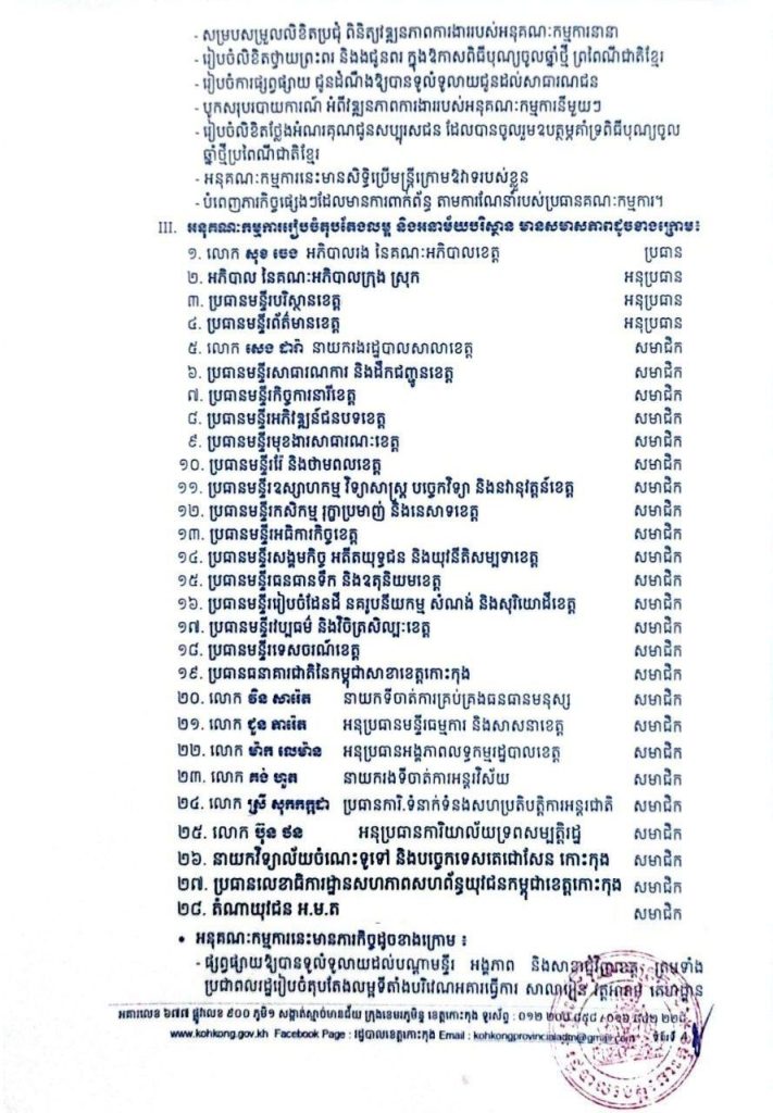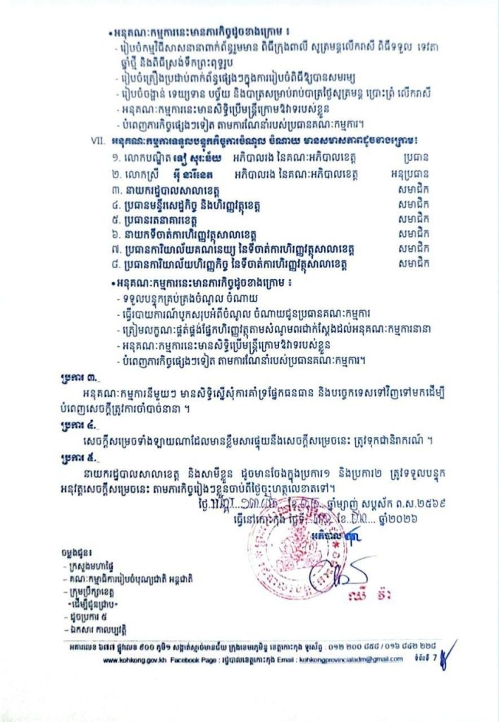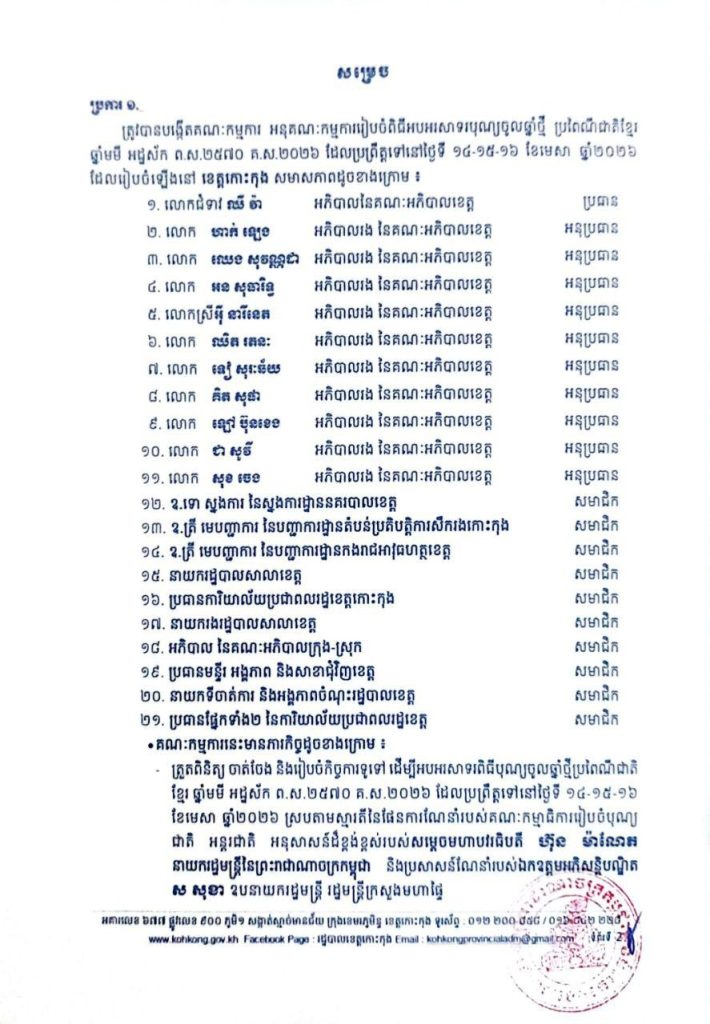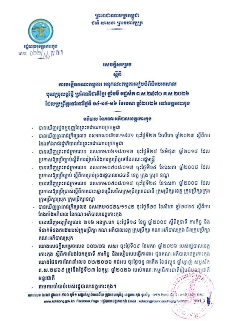 សេចក្តីសម្រេច ស្តីពីការបង្កើតគណៈកម្មការ អនុគណៈកម្មការរៀបចំពិធីអបអរសាទរ បុណ្យចូលឆ្នាំថ្មី ប្រពៃណីជាតិខ្មែរ ឆ្នាំមមី អដ្ឋស័ក ព.ស.២៥៧០ គ.ស.២០២៦ ដែលប្រព្រឹត្តទៅនៅថ្ងៃទី ១៤-១៥-១៦ ខែមេសា ឆ្នាំ២០២៦ នៅខេត្តកោះកុង