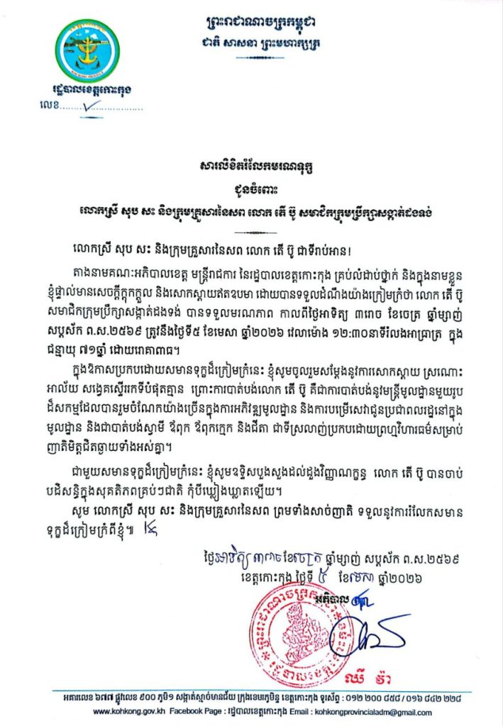 សារលិខិតរំលែកមរណទុក្ខ ជូនចំពោៈលោកស្រី សុប សះ និងក្រុមគ្រួសារនៃសព លោក តើ ប៊ូ សមាជិកក្រុមប្រឹក្សាសង្កាត់ដងទង់