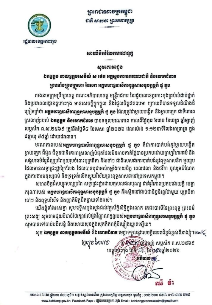 សារលិខិតរំលែកមរណទុក្ខ សូមគោរពជូន ឯកឧត្តម នាយឧត្តមសេនីយ៍ ស ថេត អគ្គស្នងការនគរបាលជាតិ និងលោកជំទាវ ព្រមទាំងក្រុមគ្រួសារ នៃសព អគ្គមហាឧបាសិកាពុទ្ធសាសនូបត្ថម្ភក៍ ផូ ភួង